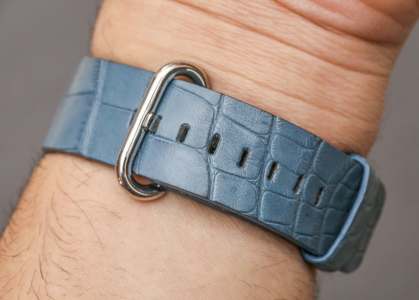 Bianca Mosca Apple Watch表帶目前有 10 種顏色可供 42 毫米和 38 毫米 Apple Watch 使用,搭配精鋼、黃金色調或玫瑰金色金屬配件。這是“Blue Jeans”彩色鱷魚皮表帶,據 Bianca Mosca 稱,他們所有的 Apple Watch 表帶都是在法國生產的。