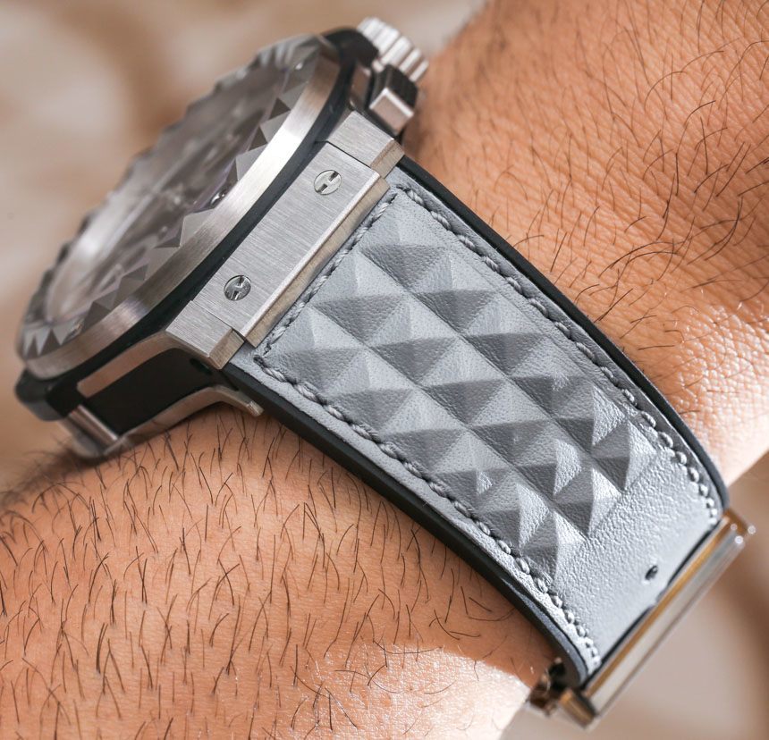 銀色表帶對(duì)我來(lái)說(shuō)真的很有趣,因?yàn)槟阏娴目床坏接羞@樣紋理/圖案的皮革。據(jù)宇舶表介紹,帶有“Clous Pyramide”裝飾的表帶上部為經(jīng)過(guò)“熱成型”處理的灰色小牛皮。對(duì)于一些收藏家來(lái)說(shuō),這款鋼表帶或現(xiàn)有的黑色陶瓷 Hublot Big Bang Depeche Mode 手表可能值得。皮革下面是黑色橡膠襯里。