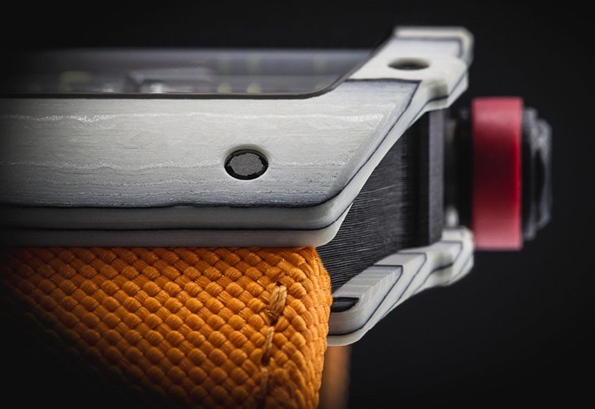 石英 TPT 使用數百層極細的細絲,使用石英晶體以及(在這種情況下)主要是白色樹脂制成。細絲層粘合在一起,然后經過特殊切割以產生所需的木紋效果。石英 TPT 用于外殼正面和背面,NTPT 碳(以類似的方式生產以獲得木紋紋理)用于外殼的中間部分。該品牌在 Richard Mille RM27-02 Rafael Nadal Quartz TPT 中的另一個新功能是一種使用手表底蓋作為機芯實際背板的生產技術。