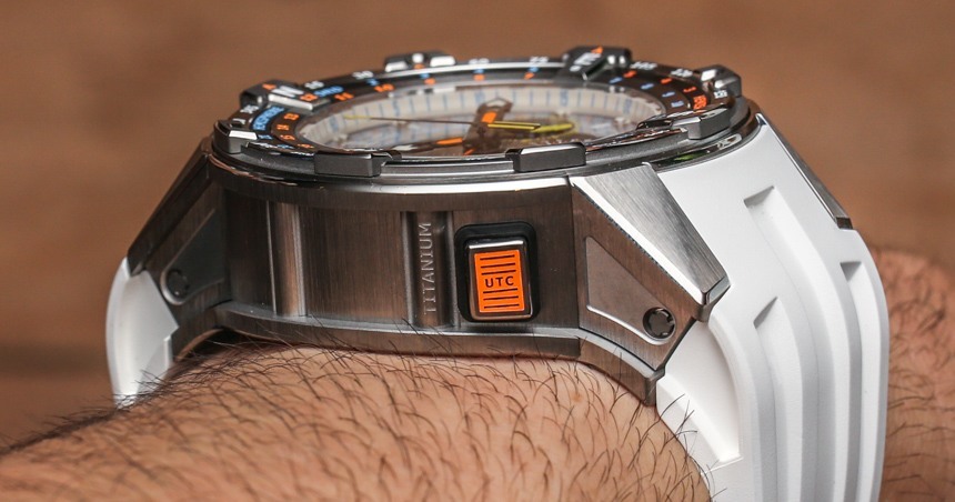 自動機芯的其他功能包括 GMT 指針(表殼上有一個專門用于調整第二時區的按鈕)、大日期指示器和月份指示器(年歷)。表殼有一個用于導航的雙向旋轉表圈,上面有各種羅盤和其他標記,表殼還有一個特殊的表冠鎖定環,而不是旋入式環。
