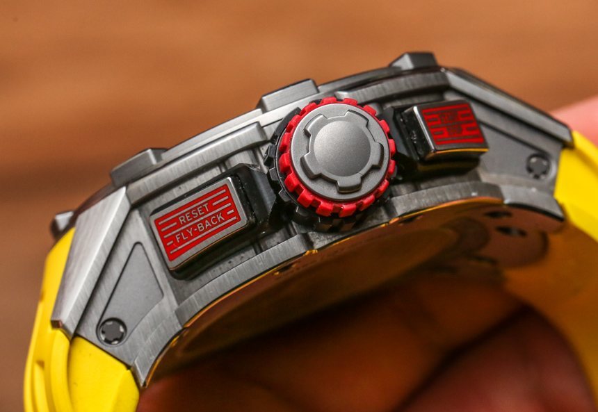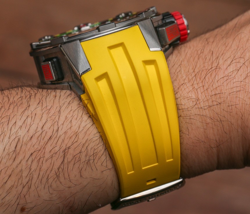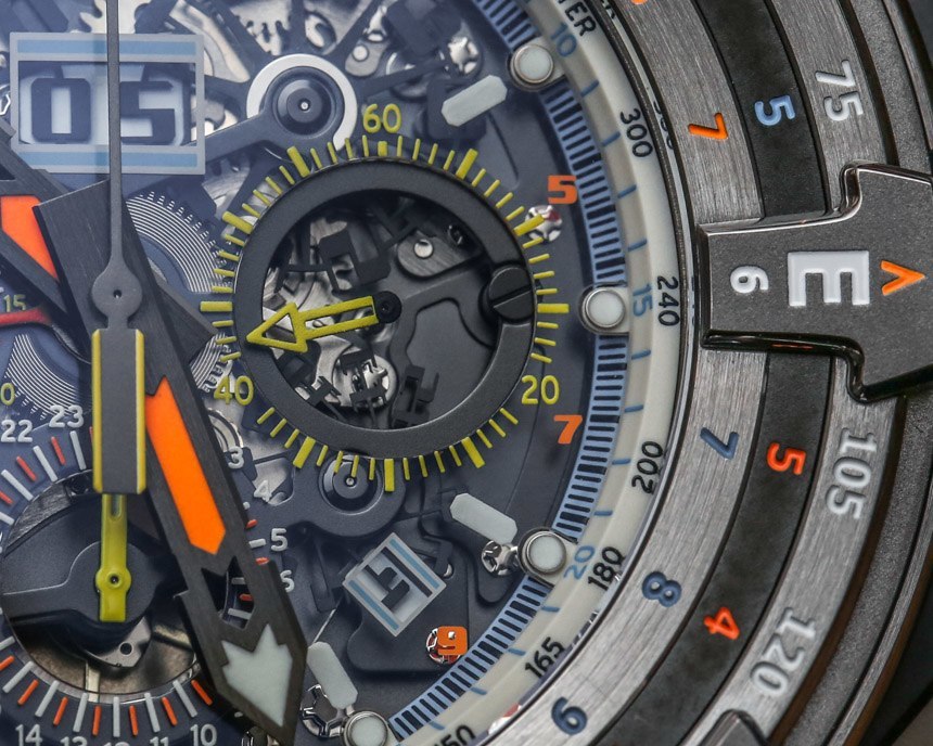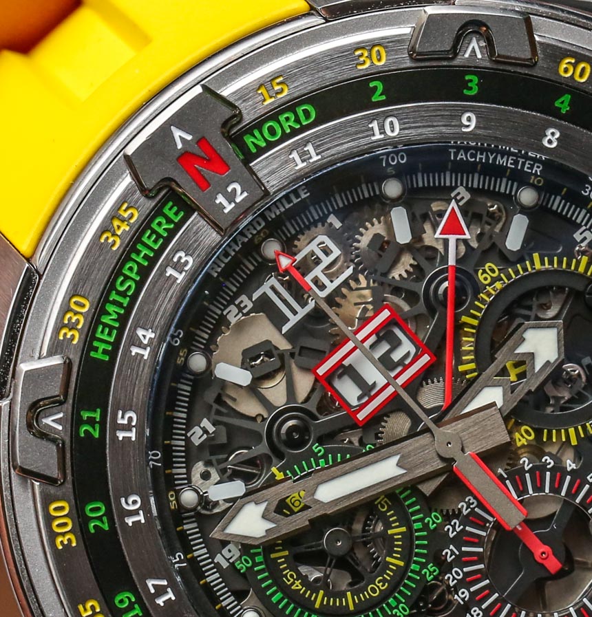回到表盤,您當然可以看到機芯的骨架視圖,但由于適當的紋理和清晰的細節應用(以及在這種情況下,明亮的顏色),確保了易讀性。這不是第一款 Richard Mille 手表用顏色來嘲笑玩 Fisher Price 玩具的幼兒,但在我看來,“極端”的調色板只會增加像這樣的限量版模型的小眾吸引力。
