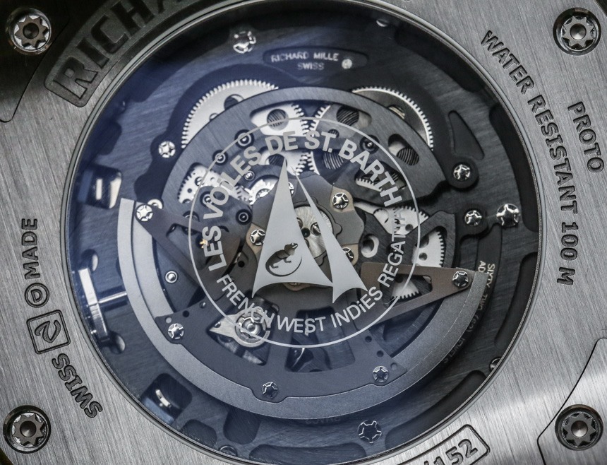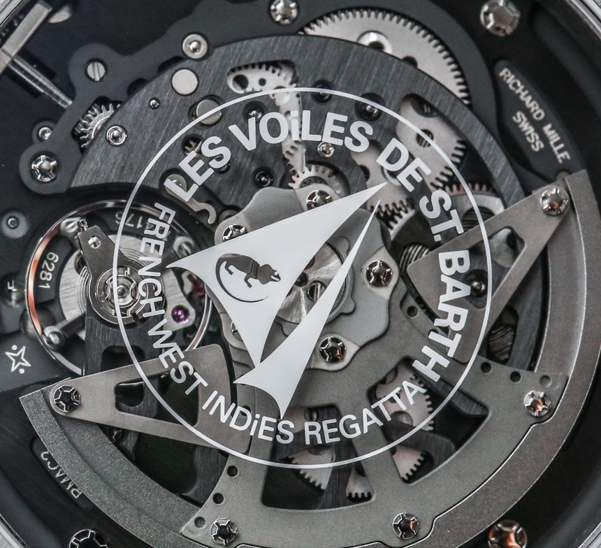 透過 Richard Mille RM 60-01 Automatic Flyback Chronograph Regatta 表殼的背面,可以看到具有現代外觀的自動機械機芯,其黑色板材和 Richard Mille 聞名的獨特“花鍵螺絲”。藍寶石水晶窗上方是 Les Voiles de St. Barth 標志,指的是限量版時計與活動的聯系。
