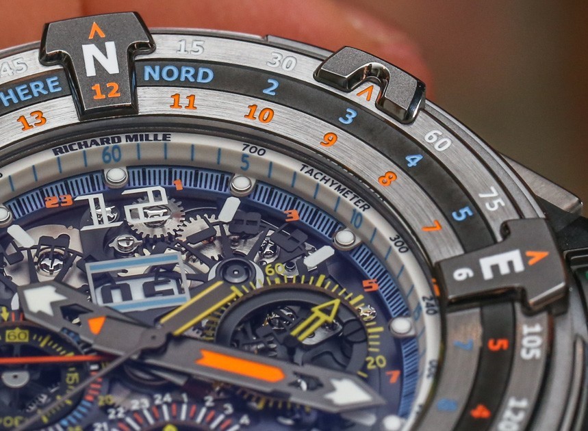 說到旋轉表圈——操作 Richard Mille RM 60-01 自動飛返計時碼表 Regatta 的表圈是一種樂趣,因為它轉動并發出咔嗒聲,并帶有美妙的觸覺反饋和聲音。仔細觀察表圈以及表殼和表盤的其他部分,可以發現標記以鮮艷的顏色印刷得多么漂亮。