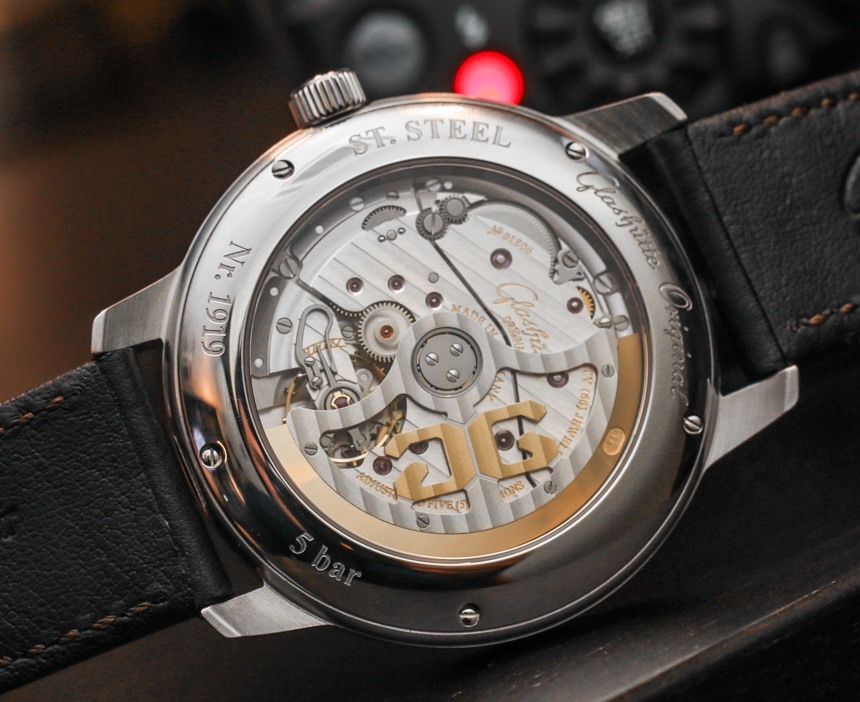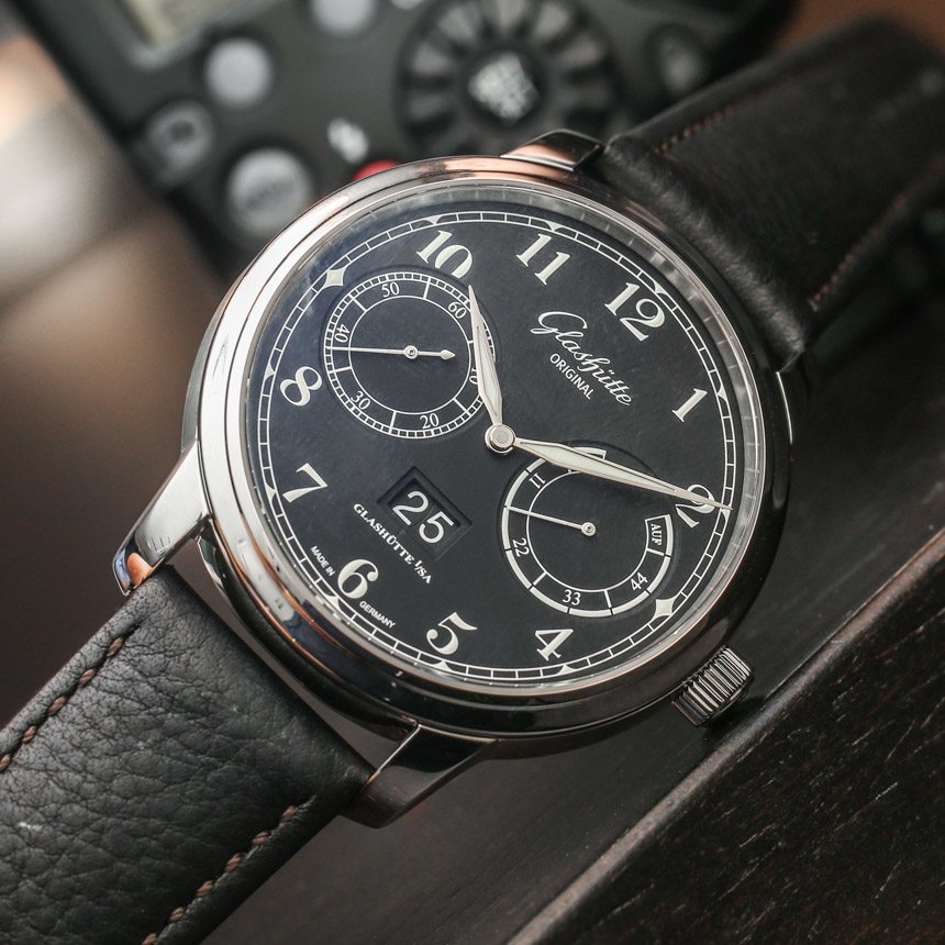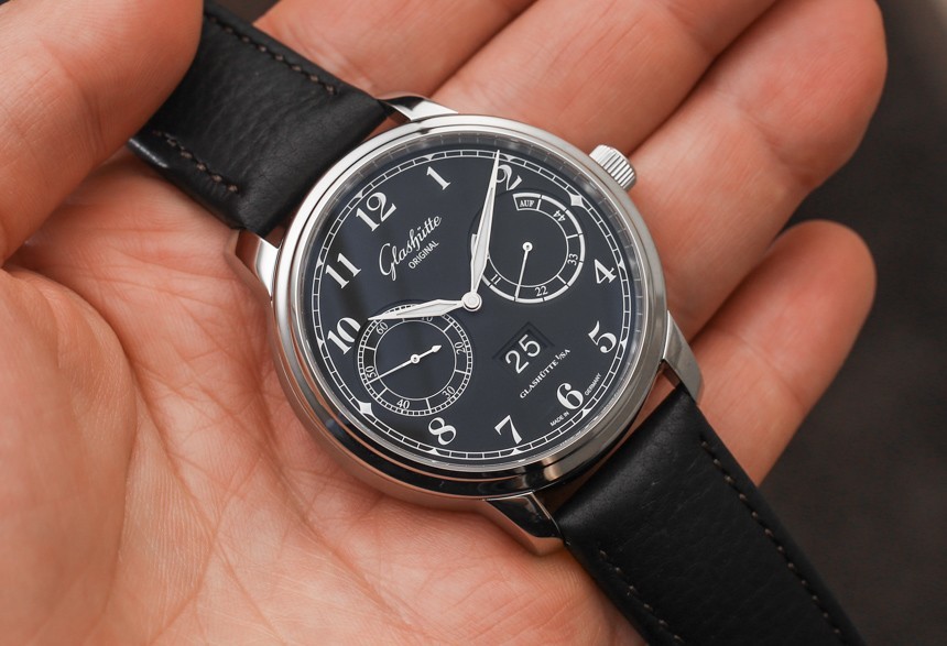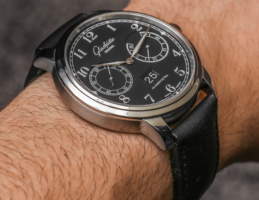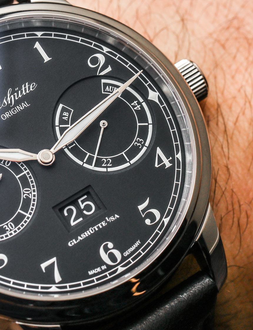 格拉蘇蒂原創 100-14 機芯是一款裝飾精美的自動機芯,以 4Hz(28,800 bph)的頻率運行,動力儲存為 55 小時。自動擺陀為 21k 金。它提供帶有輔助秒盤的時間、動力儲存指示器和大日期指示器(他們稱之為“全景日期”窗口)。我喜歡的是表盤功能的布局如何具有崇高的對稱性以及對易讀性的敏銳眼光。
