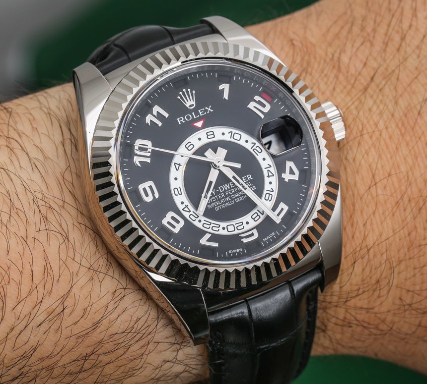 當勞力士首次推出勞力士 Sky-Dweller 時,它只有黃金材質——但有 18k 金、玫瑰金 (Everose) 和白金。2014 年,勞力士將腕表系列翻了一番,從三款增加到六款。仍然沒有任何新的材料選項,但有新的表盤樣式(本文中介紹的那些型號),以及表帶或手鐲的新選項。您會注意到,勞力士在表帶上提供勞力士 Sky-Dweller 的某些表盤版本,在配套的 18k 金手鏈上提供其他表盤版本。