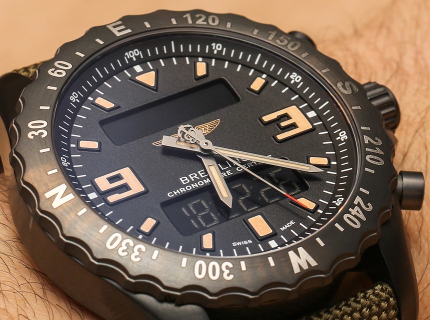 關于 Breiting Chronospace Military 的更多好消息是,與其他 Chronospace 型號相比,Breitling 通過調低表盤來美化表盤。將其與標準Breitling Chronospace 手表的表盤進行比較(此處為實際操作)。這意味著更小的 3 點鐘和 9 點鐘小時指示器,更簡單的啞光黑色表盤,以及放棄內部旋轉滑尺表圈(在我看來這真的只適用于 Navitimer)以實現簡單的分鐘軌道。Breliting Chronospace Military 周圍的表圈現在帶有羅盤指示器,用于導航目的。