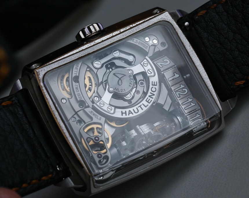 另請注意,Hautlence HL2 表殼有一個不對稱的藍寶石水晶,環繞在表殼的左側。是的,Hautlence 設計它是為了讓您更好地觀察放置在旋轉堆疊上的緩慢旋轉調節系統(擺輪和擒縱機構)。該機芯是我想到的最有趣的機芯之一,也是豪朗時 (Hautlence) 精神的核心,致力于“以不同方式”報時。總而言之,機芯是自動機芯,以小時和分鐘顯示時間,還有動力儲存指示器。
