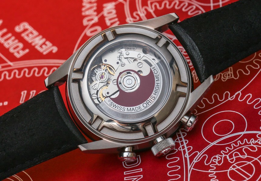 Oris Audi Sport Limited Edition 腕表的表殼防水深度達(dá) 100 米,藍(lán)寶石水晶表鏡上有做工精良的 AR 涂層。手表內(nèi)部是 Oris 口徑 774,我很高興看到它們清楚地表明它是瑞士 Sellita SW 500 的基礎(chǔ)(ETA Valjoux 7750 克隆)。感謝他們清楚這一點(diǎn)。該機(jī)芯使用了 Oris 品牌手表典型的紅色涂漆自動轉(zhuǎn)子。