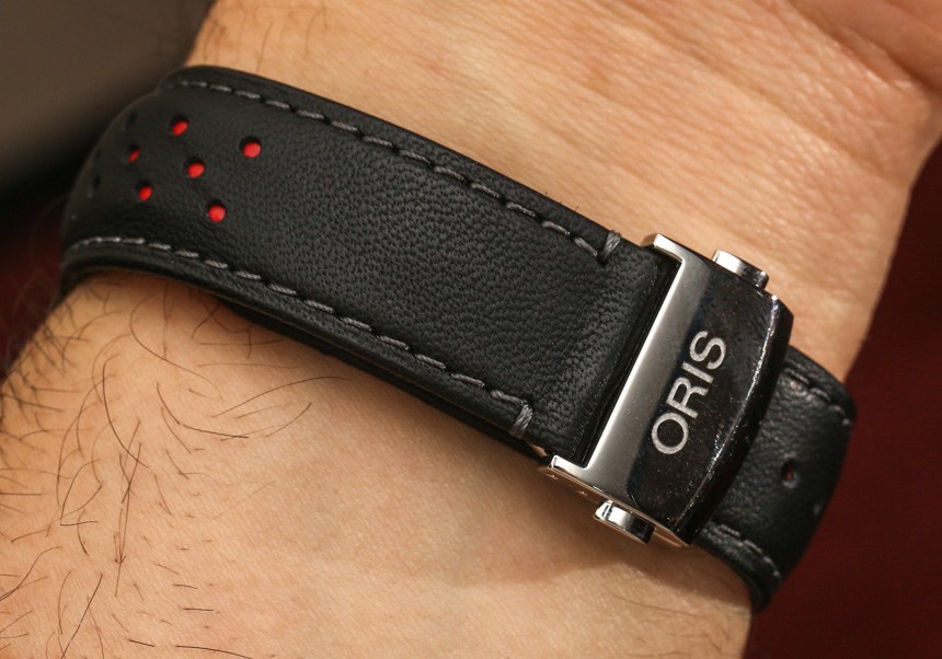 單看手表,我仍然對薄型旋轉(zhuǎn)計時表圈和更大感覺的表盤印象深刻。按鈕和表冠做工精細(xì),整體外觀和手感對于 Oris 來說都是一流的。與表殼相連的是帶有鈦金屬展開式表扣的穿孔賽車風(fēng)格皮革表帶。