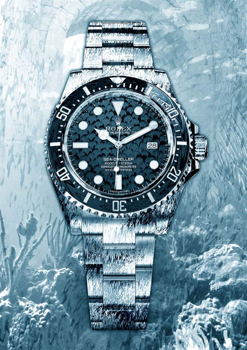 潛水表的靈感來自水嗎?是和不是。勞力士 Sea-Dweller 4000 Water 概念就是這樣,并從流動的液體和海洋生物中汲取靈感。Niklas 將這款 Sea-Dweller 設(shè)計想象成“大馬士革鋼,具有流動的幾乎液態(tài)金屬表面的幻覺。它有一個帶有特寫鯊魚皮圖案的表盤。終極潛水表應(yīng)該看起來像鯊魚一樣銳利!這是一款海洋生物手表,可能會愛或恐懼?;騼烧?!” 這是一個有趣且兩極分化的概念,再次借鑒了自然紋理和美學(xué)。