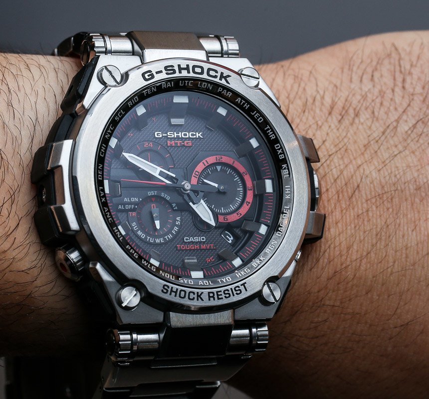 Casio G-Shock MT-G 外殼背面的那種三角形標志是大多數高端 G-Shock 上使用的特殊符號,稱為“Triple G Resist”。這意味著手表特別能抵抗 1) 沖擊、2) 振動和 3) 離心力(高速)。與大多數卡西歐 G-Shock 手表一樣,MT-G 手表防水深度達 200 米,作為高端 G-Shock 手表,它們具有鍍增透膜的藍寶石水晶。在手腕上,它們比 MR-G 手表大一點,寬 53.5 毫米。它很大,但特殊(或多或少牢不可破)管狀樞軸上的完整鉸接式表耳非常適合讓手表牢固地抓住您的手腕。