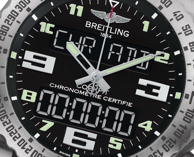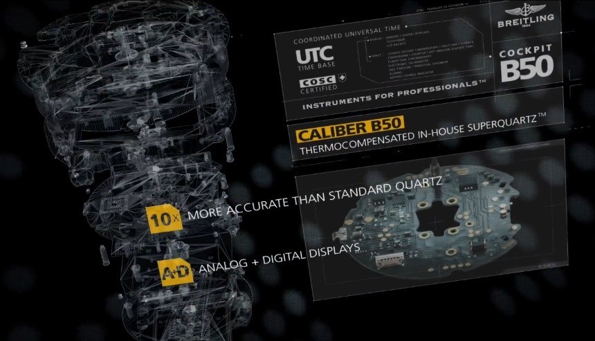 除了作為推動器的表冠外,B50 機芯還有另外兩個作為計時推動器的推動器,也許還可以做其他事情。百年靈似乎為腕表添加了一些新功能,這些功能在 ETA 設計的 SuperQuartz 機芯中是不存在的。標準功能包括時間、萬年歷、1/100 秒計時碼表、鬧鐘、電池充電指示器、倒計時器、電子轉速計和第二時區。我認為他們的一些其他類似手表中不存在的新功能現在可用于 B50 機芯,包括特殊倒計時或計數任務經過時間 (MET) 指示器和飛行時間計時碼表。