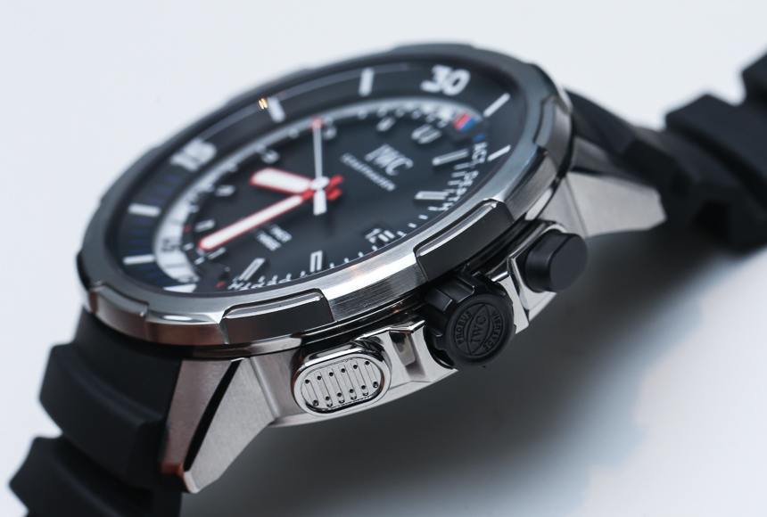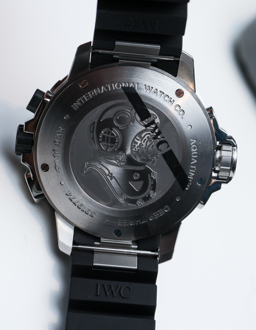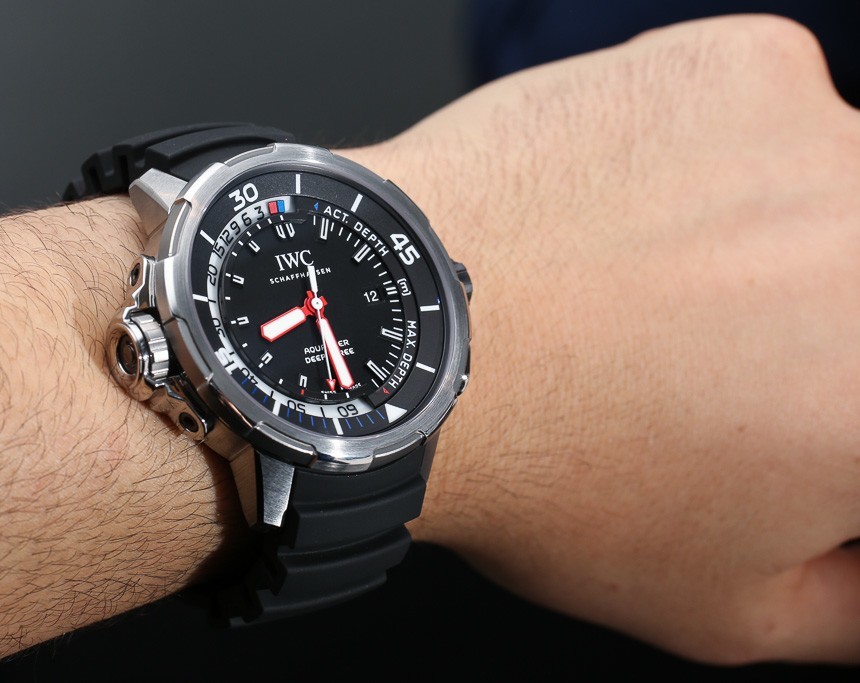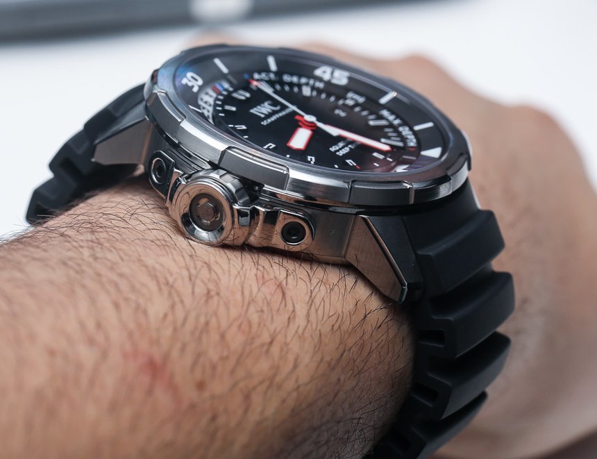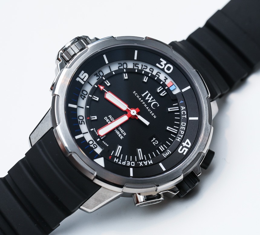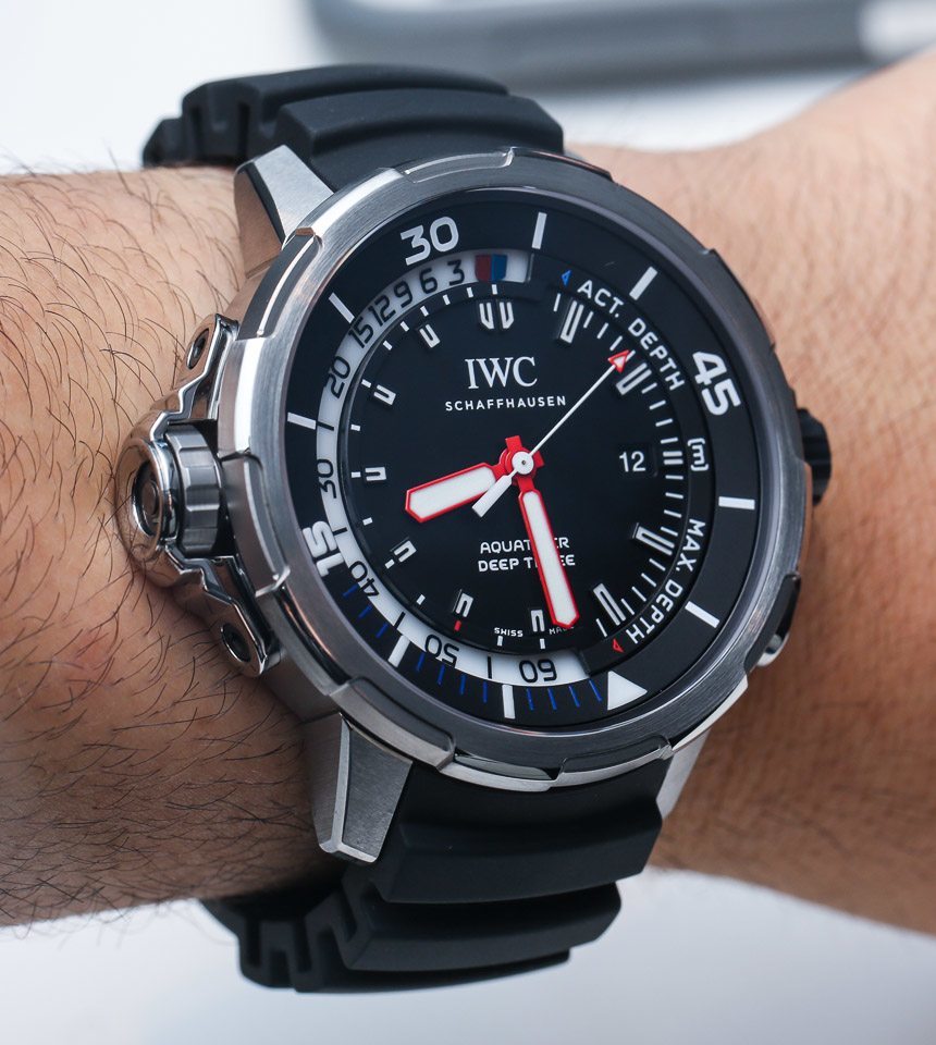 IWC萬國表Aquatimer Deep Three的表殼材質采用鈦金屬。它當然具有我們喜愛的海洋時計系列的酷炫新功能。我要再說一次,“SafeDive”棘輪旋轉潛水表圈系統非常棒,表帶的快速釋放系統也非常出色。