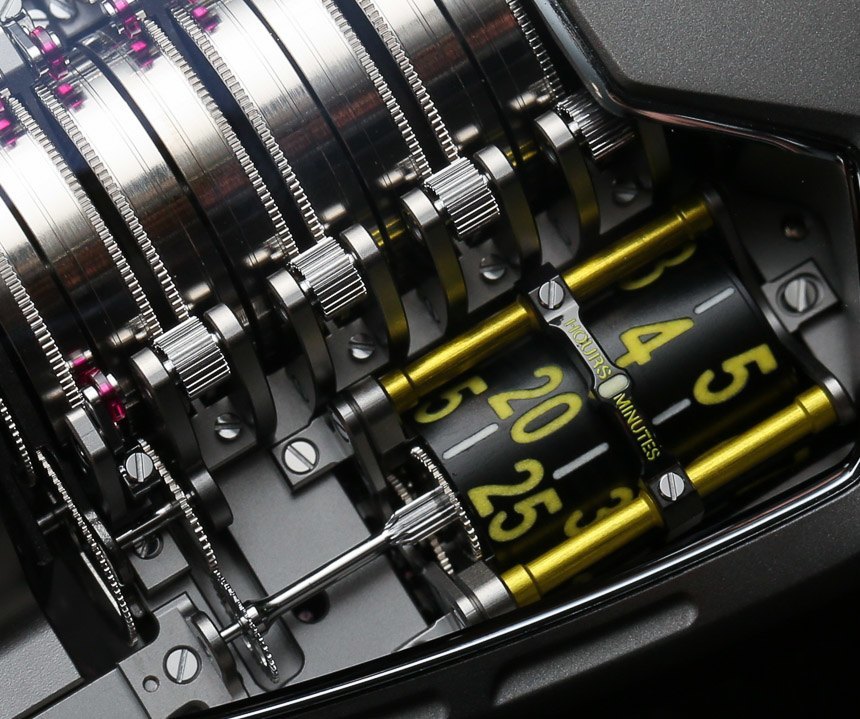 手表指示什么?實際上只是帶秒針的時間(通過陀飛輪)和動力儲存指示器。發條盒的左側是兩個轉動的鼓,指示動力儲存,頂部的鼓似乎是幾天,下面的一個似乎是小時。在表盤的相鄰一側有兩個鼓代表時間,上面一個鼓代表小時,下面一個代表分鐘。一個較薄的秒針鼓位于陀飛輪附近,作為其旋轉框架的一部分。