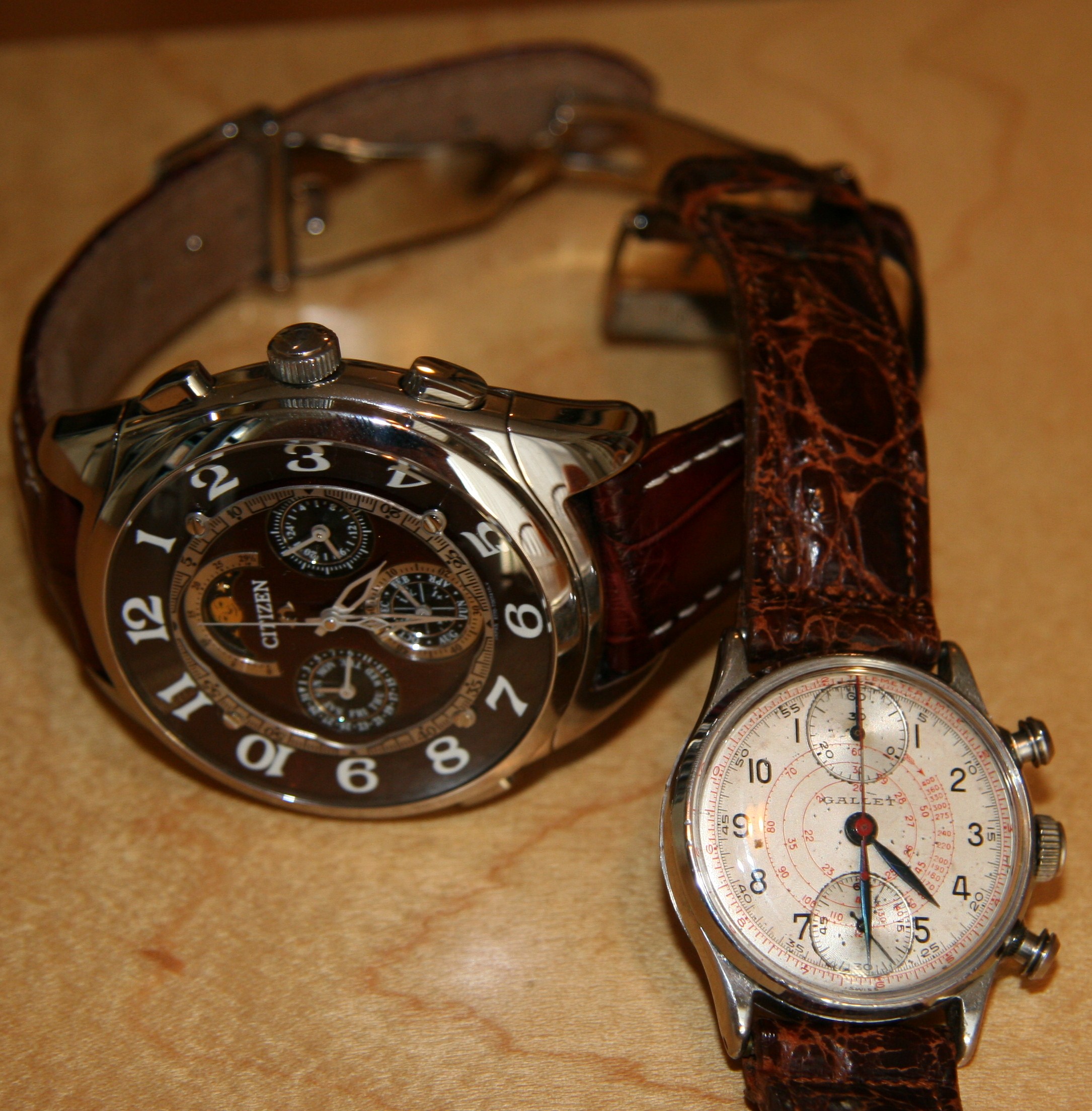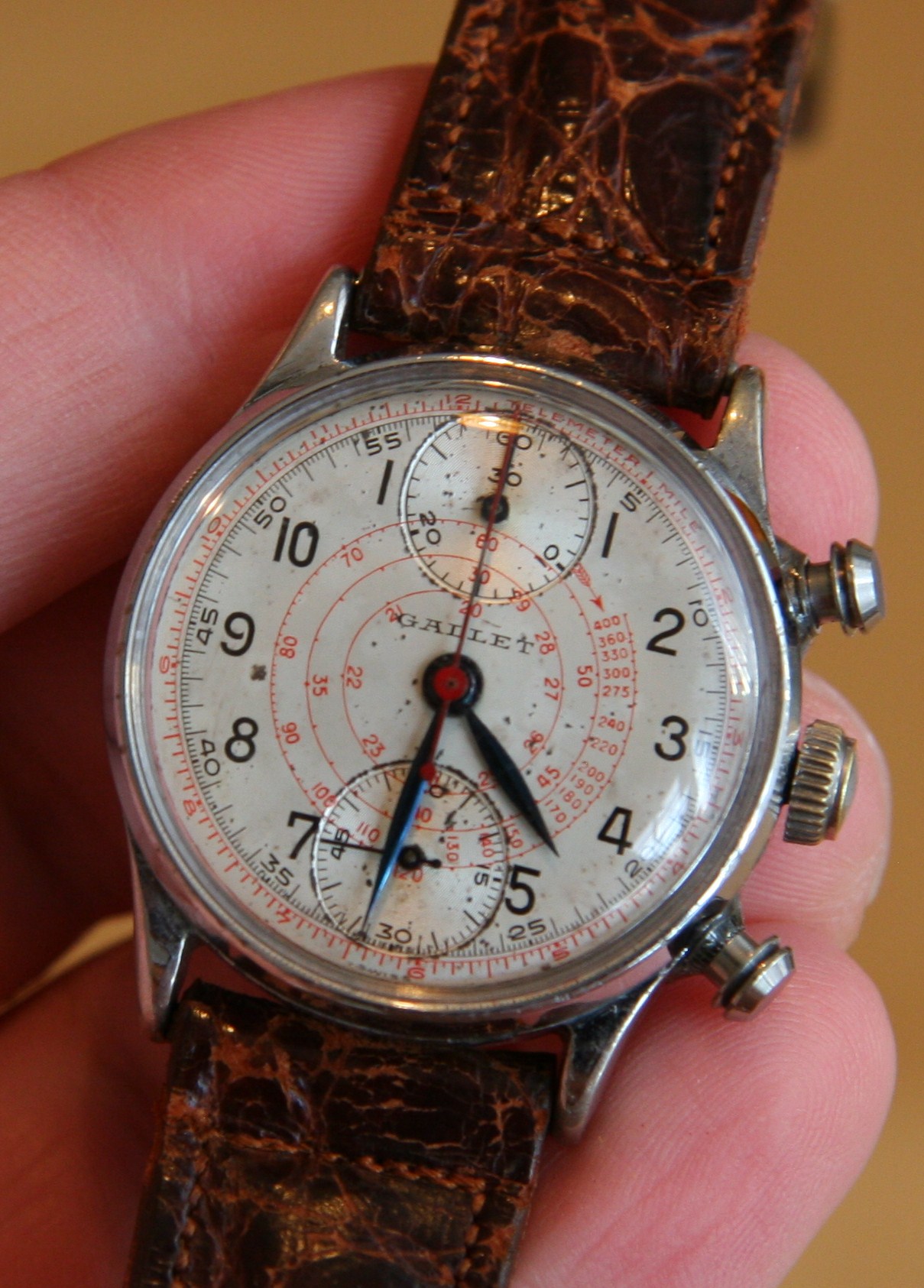 我的實(shí)驗(yàn)標(biāo)本是剛修復(fù)的Gallet。我對(duì)手表了解不多,因?yàn)樗浅:币?jiàn)。但我可以估計(jì)它很可能是在 1940 年代初至中期(可能是 1930 年代)制造的。這只手表是我的祖父,當(dāng)我得到它時(shí),它年久失修(無(wú)法工作,缺少水晶,劇烈氧化)。它現(xiàn)在又起作用了,在我的手腕上。修復(fù)過(guò)程的細(xì)節(jié)我就不多說(shuō)了,但是由于找零件的困難,這個(gè)修復(fù)項(xiàng)目遠(yuǎn)遠(yuǎn)超出了常規(guī),花了大約一年的時(shí)間坐在那里等待零件。我大部分原創(chuàng)的Gallet以一種令人印象深刻的但明顯的復(fù)古狀態(tài)回到了我身邊。我遠(yuǎn)離古董這個(gè)詞,因?yàn)檫@意味著過(guò)時(shí),而這里的情況并非如此。人們可以買(mǎi)到一款完美的現(xiàn)代手表,其機(jī)芯和功能與這款小Gallet相似。