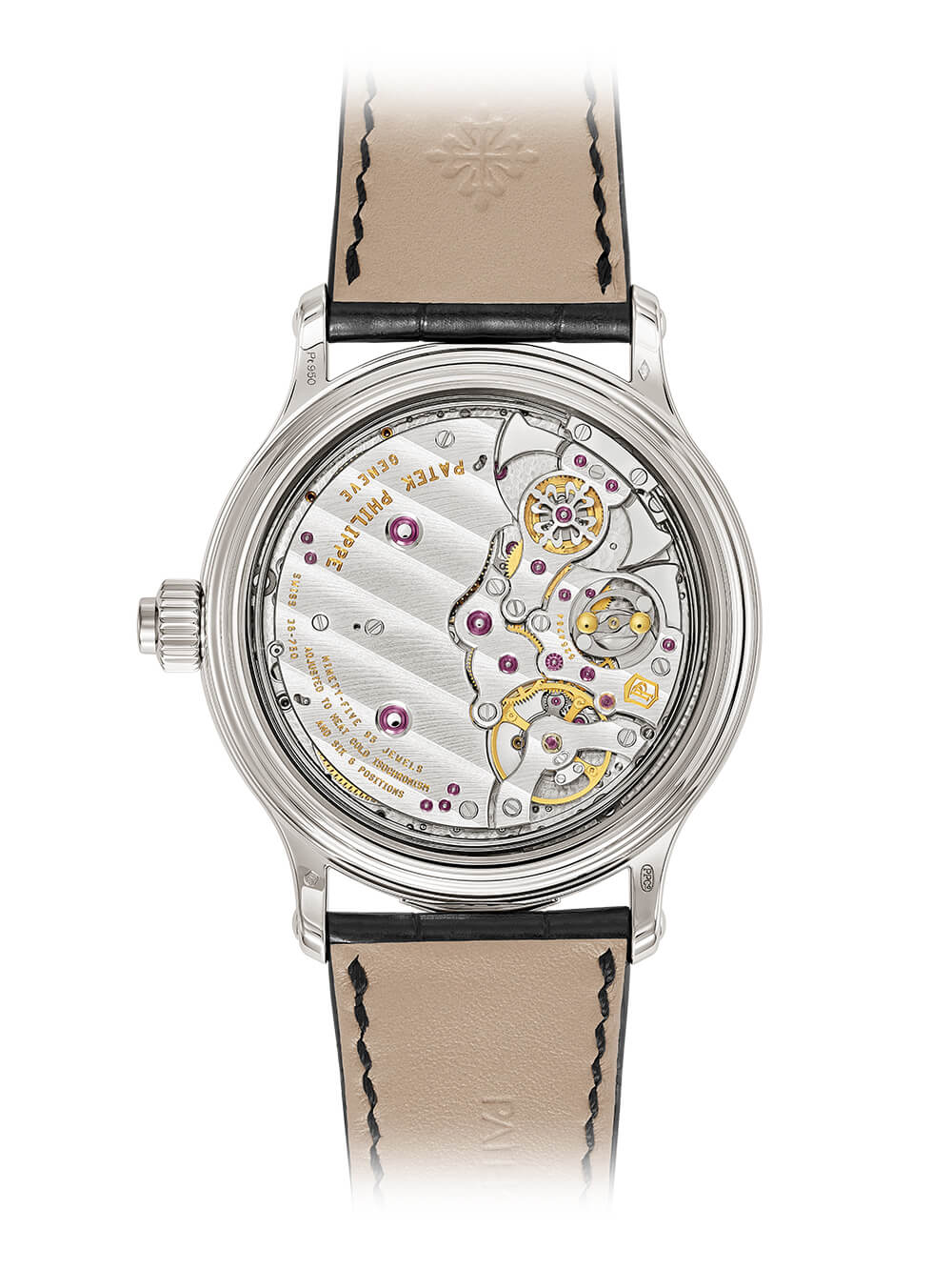 機(jī)芯: Calibre GS 36-750 PS IRM,37mm x 7.5mm,手動上鏈,95 顆寶石,703 個(gè)零件,百達(dá)翡麗印章 頻率: 25,200 vph (3.5 Hz)動力儲存: 72 小時(shí)(機(jī)芯),24 小時(shí)(罷工)功能: