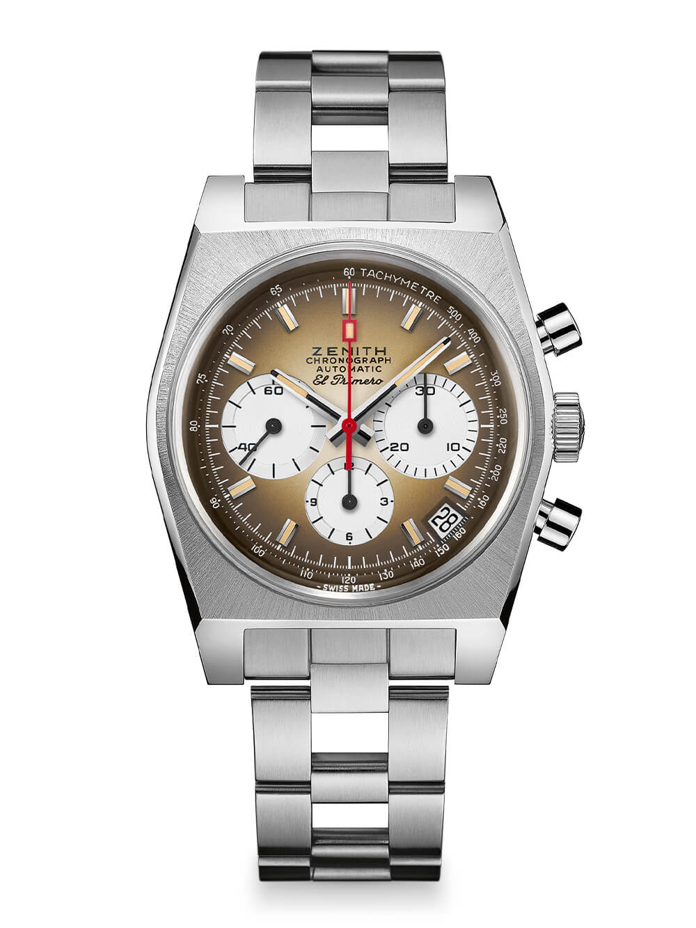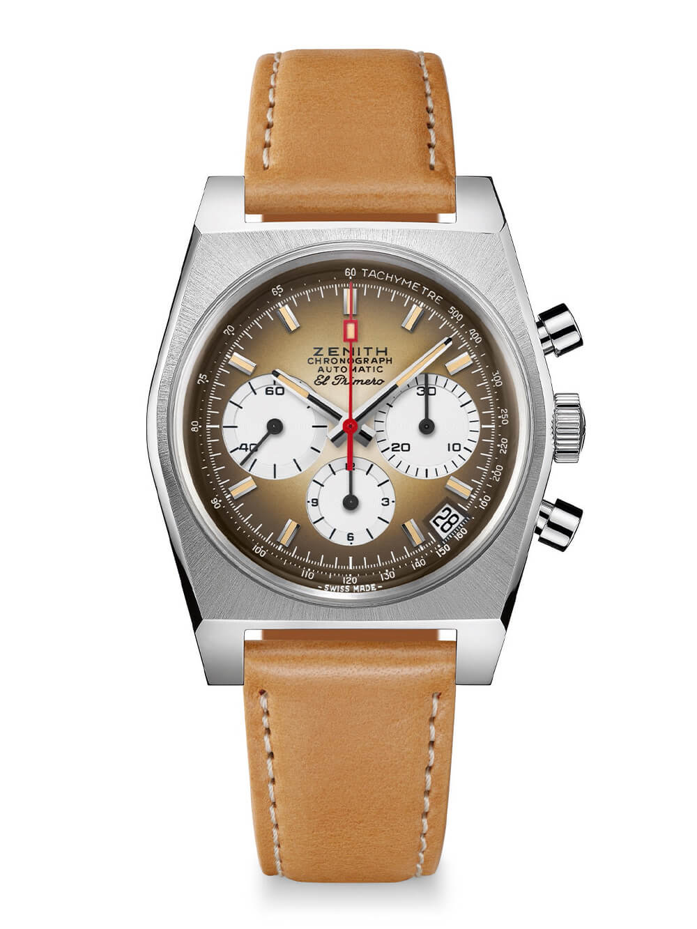這意味著相同的 37 毫米表殼、相同的 El Primero 400 機芯和相同的暖棕色陰影,邊緣逐漸變黑。搭配米色夜光時標和對比鮮明的純白色計時盤,全新配色帶來純粹的復古氣息。