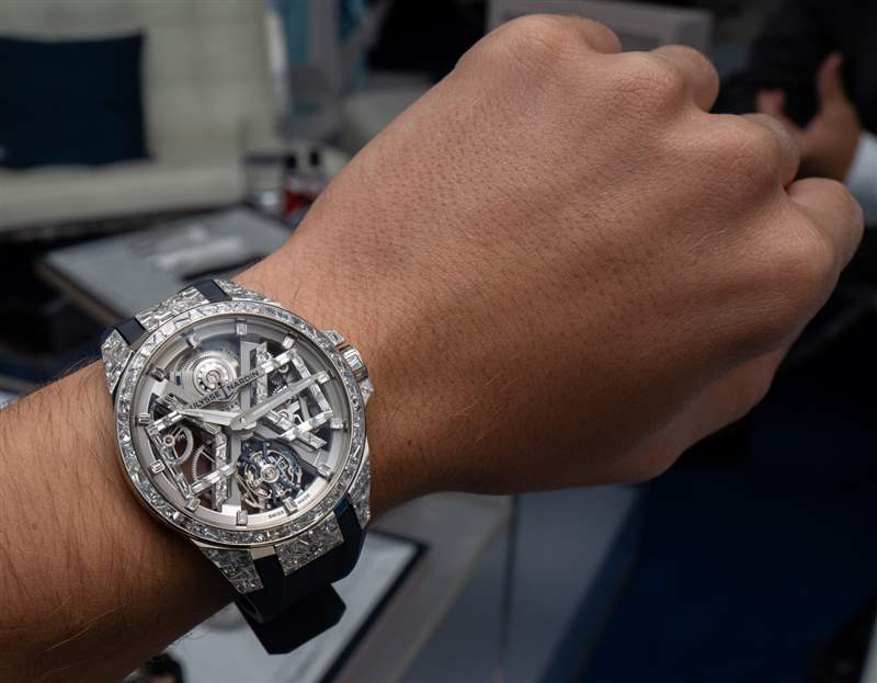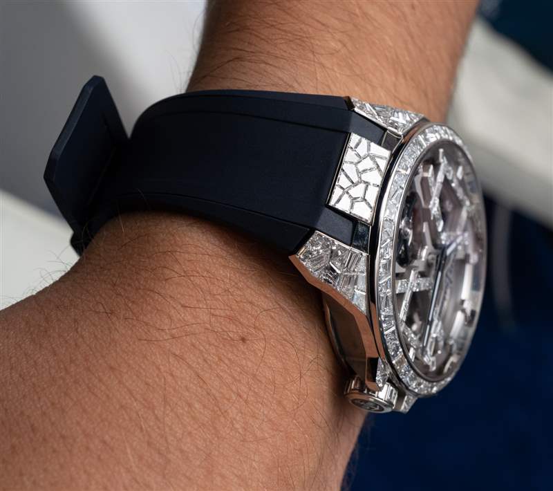Sabatier 先生最值得稱贊的是他回答問題的深思熟慮的方法,以及他在將其他行業的聰明教訓借鑒到開發和制造機械手表的世界時毫不拘束。從視覺上看,您在圖片中看到的手表是 Ulysse Nardin Blast 的特殊“高級珠寶”版本:覆蓋著鉆石。該手表被稱為參考 1720-400BLE-3A/01 或 1720-400BLE-3A/00 Ulysse Nardin Sparkling Blast。表殼上共鑲嵌 211 顆鉆石(鉆石重量為 13 克拉)。45 毫米寬的表殼由 18k 白金制成,特殊的鉆石鑲嵌風格以更加有機的“裂紋鏡子”風格完成,極具陽剛氣息,在市場上也是獨一無二的。Ulysse Nardin Sparkling Blast 的價格是410,000 美元