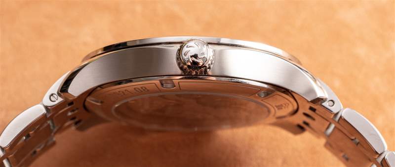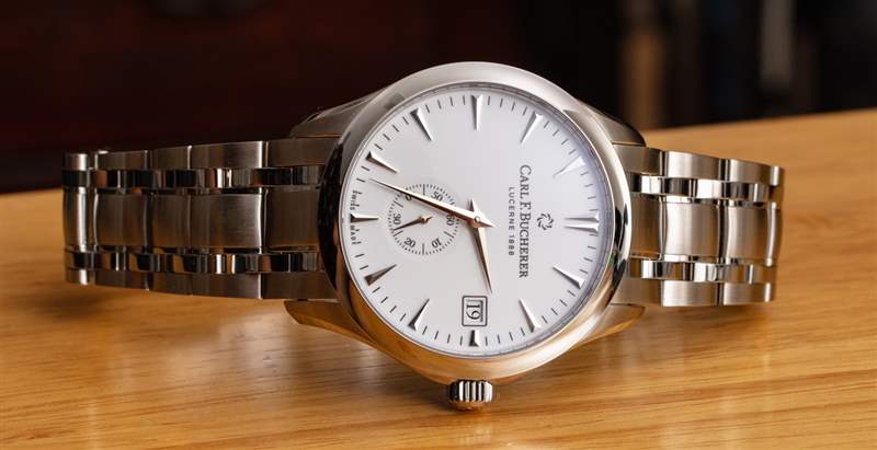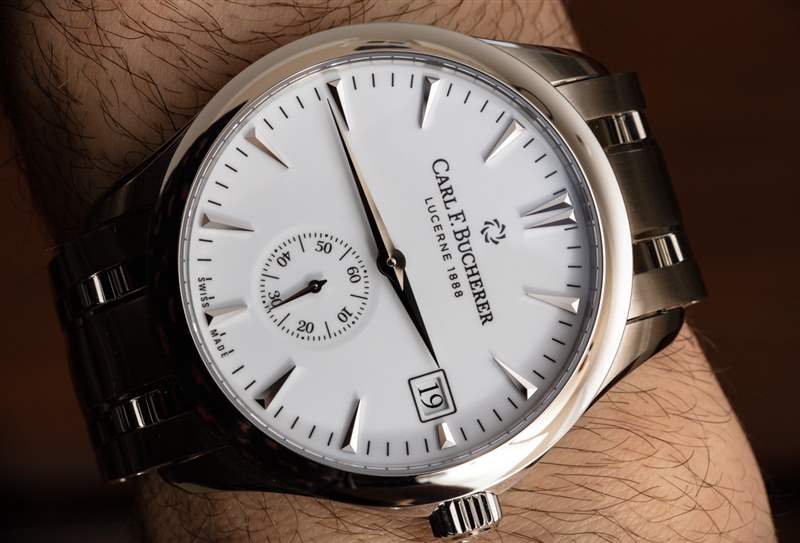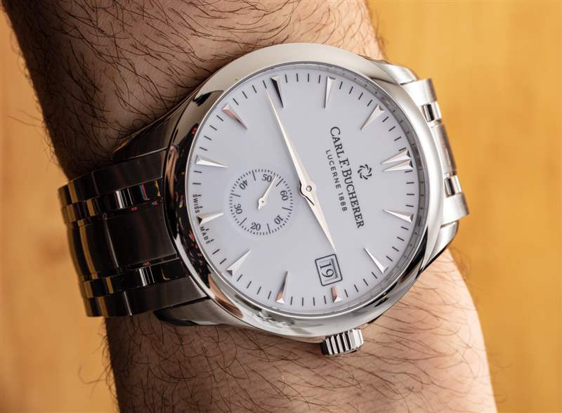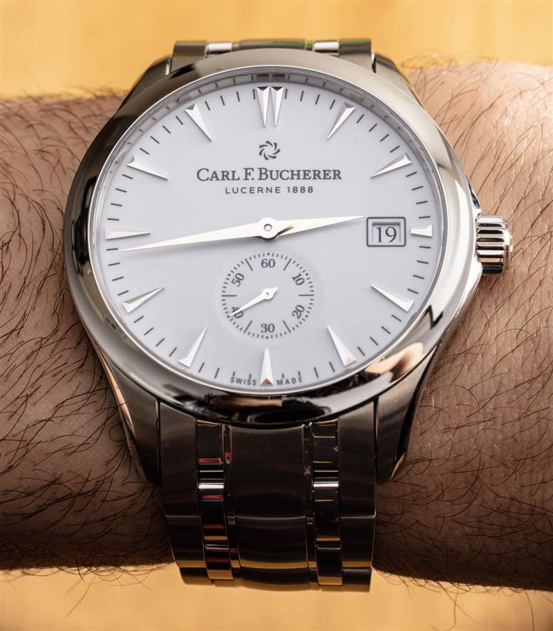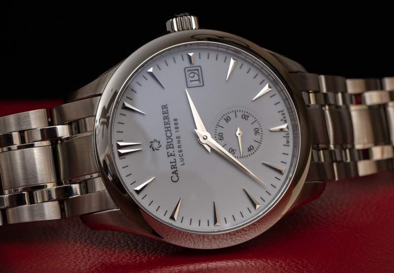 這種清晰易讀的白色表盤手表并不常見。這通常是因為拋光的指針和時標與表盤融為一體。這是一款價格更高的手表,因此您在這里不會真正遇到這個問題。時標、指針和藍寶石水晶底部之間有足夠的空間,可以清楚地看到臉部。我還想贊揚 Carl F. Bucherer 在略微圓頂的藍寶石水晶表鏡上使用適量的增透膜,這意味著眩光顯著降低。