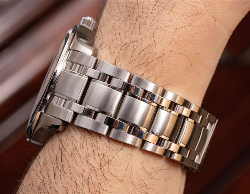 這個特殊版本的 Manero Peripheral 43 毫米是參考 00.10921.08.23.21,它有一個白色的表盤和配套的鋼表鏈。手鐲值得評論,因為大多數 Manero Peripheral 手表似乎都配備了表帶。手鏈與表殼的設計完美融合,拋光表面與光線交相輝映,營造出一種視覺奇觀。從設計的角度來看,表帶略微變細,這有助于在視覺上減輕表殼的質量,也讓表帶佩戴起來更加舒適。Carl F. Bucherer 使用蝴蝶式展開式表扣,手鐲進一步包括半鏈節(jié),使其尺寸更適合您的手腕。
