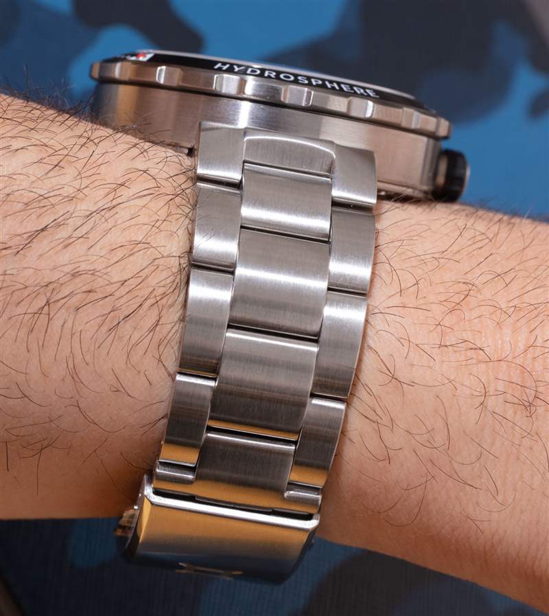 作為一款潛水表,Hydrosphere 防水深度達 250 米,并內置自動排氦閥。表殼較大,寬 45 毫米,但由于相對較窄、粗短的表耳,它的磨損較小。更重要的是,由于表耳放置在表殼的底部,Hydrosphere 感覺就像騎在手腕上,這提高了舒適度,并使整體尺寸更適合較小的手腕。表殼厚度也接近 15 毫米,采用圓頂藍寶石水晶表鏡。它不會感覺太厚,但這本身就不是一塊小手表。盡管據說表殼有 45 毫米寬,但表圈本身還是有點寬,大約 47 毫米寬。再說一次,這是一款更大的時計,但它的佩戴比它的體積建議的要小一些。廣告訊息廣告信息結束