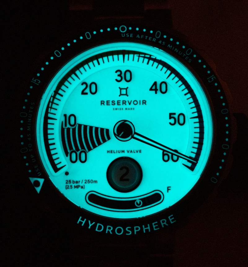 Reservoir 為 Hydrosphere 設計了一個相當保守的底蓋——我認為這有點錯過了機會。不,我不想要一些俗氣的潛水員雕刻,但某些主題視覺效果或運動視圖可能有助于為這道美味的鐘表菜肴增添風味。說到視覺效果,這款 Hydrosphere 的 Air Gauge 版本有一個完全涂漆的表盤。流明并沒有涂得特別厚,但表盤上有很多。不幸的是,跳時窗口中的數字沒有涂上夜光漆。因此,雖然 Hydrosphere Air Gauge 的黑暗效果看起來很酷,但它受到一些小的實用性問題的影響,我覺得 Reservoir 品牌將在未來的潛水表型號中進行補救,因為這些產品太好了,不能持續很長時間未來。