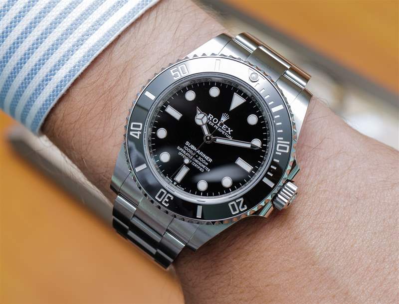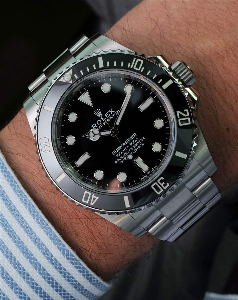 與勞力士 Submariner 手表“頭”一樣漂亮的是手鐲。與 No Date Submariner 的其他產品一樣,該表鏈經過重新設計,盡管它在風格上與之前的三鏈 Oyster 表鏈(市場上最好的金屬表鏈之一)或多或少相同。手鏈仍然具有蠔式折疊安全扣和出色的尺寸微調勞力士 Glidelock 功能。在我看來,更新后的 Submariner 表鏈最大的新聞是鏈節緊密結合在一起 – 使外觀更加“無間隙”,更具高端感,與當前高人氣的“鋼表鏈表”相得益彰。