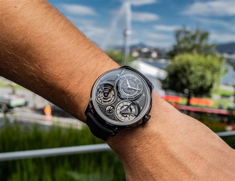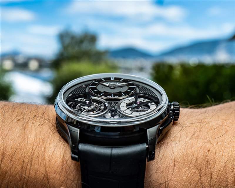 沒有受到大流行影響的是奢侈品定價,因此,這件高級鐘表的價格接近 100,000 美元大關。43.5 毫米寬的表殼由 5 級鈦金屬精密加工而成,然后經過 DLC 涂層處理,以防變色和防刮擦。藍寶石水晶夾在 50 米防水表殼上,表殼配有啞光黑色鱷魚皮表帶。