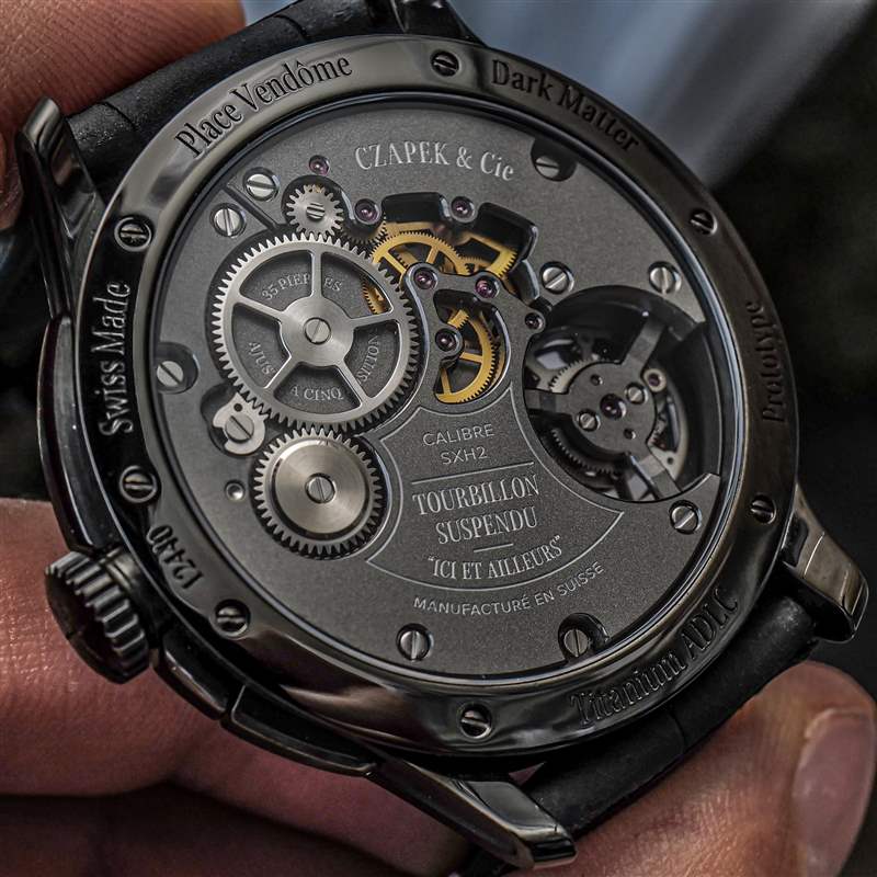 Czapek Place Vendome Tourbillon Dark Matter 腕表內部的獨家機芯是 SXH2 機芯,該機芯采用手動上鏈方式,以 3Hz 的頻率運行可提供 60 小時的動力儲存。該機芯與 Jean-Francois Mojon 的 Chrononde 機芯開發公司合作開發,8 點鐘位置有陀飛輪,4 點鐘位置有 12 小時制第二時區,6 點鐘位置有 AM/PM 指示器, 12 點鐘以下的主時間顯示內置動力儲存指示器。表盤上更有趣的工匠特色之一是主時間顯示中的黑色琺瑯環,以及外露橋板上的高級鐘表鏡面。指針本身采用 18k 白金制成。