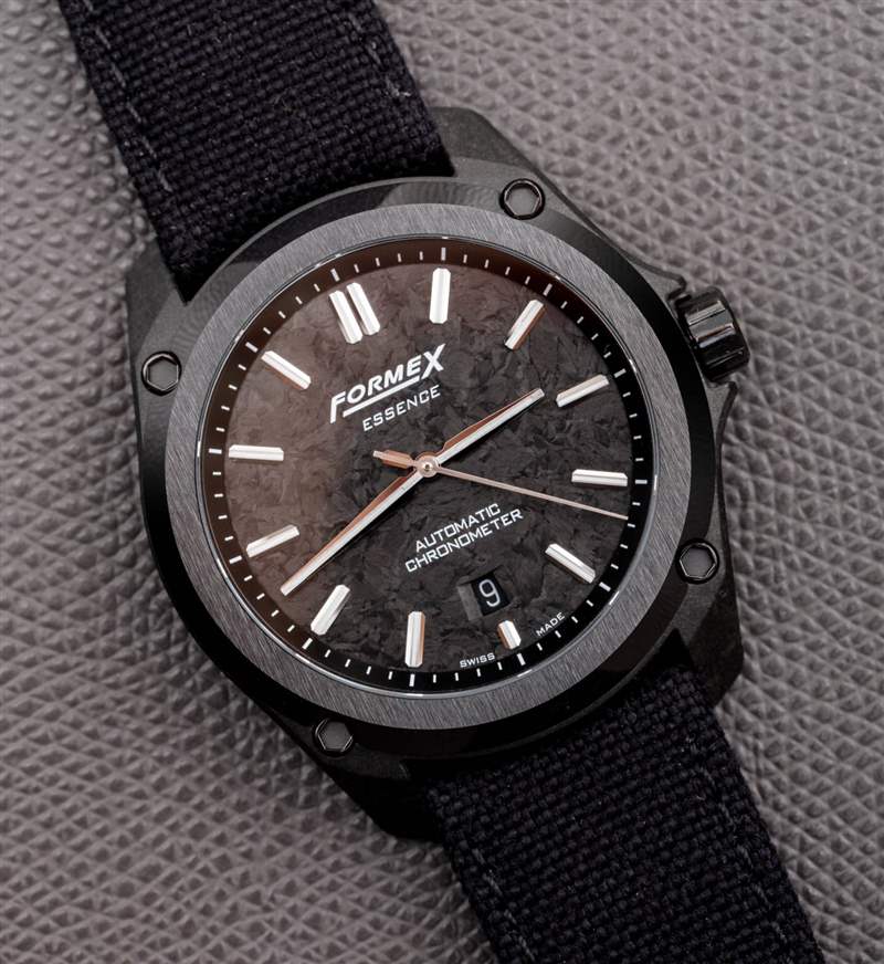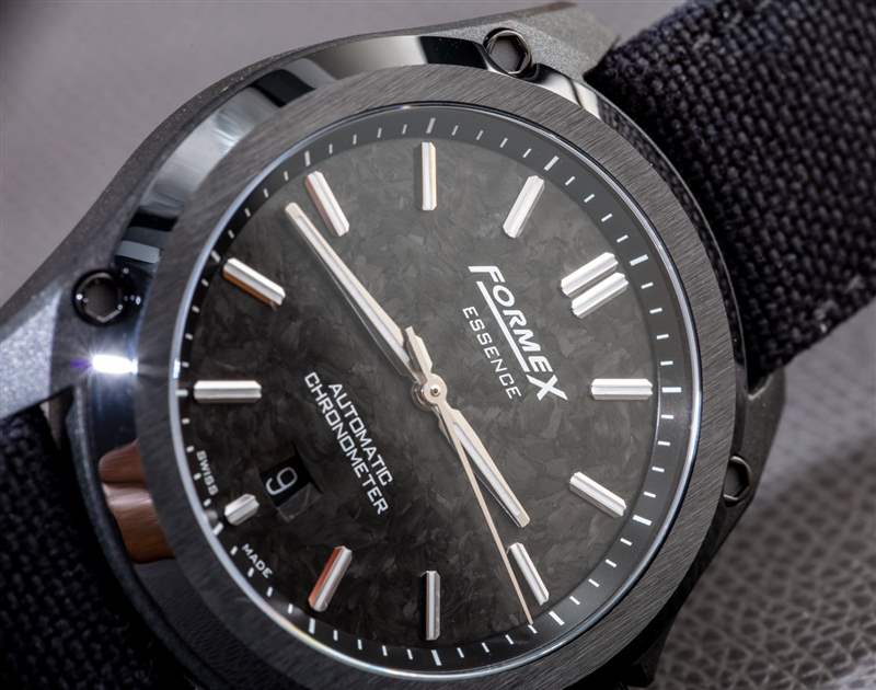 鍛造碳是一種使用碳作為精密表殼材料的方法。它由 Audemars Piguet 推廣,在最終普及之前,它被用于相當昂貴的豪華手表。愛彼在內部生產這種材料,這意味著其他使用鍛造碳的公司必須復制類似的過程才能達到自己的結果。并非所有鍛造碳纖維的外觀或感覺都相同,Formex 使用的碳纖維觸感既光滑又“柔滑”(不粗糙或不均勻)。鍛造碳首先壓縮一些碳材料,然后在高溫下烘烤。然后將產生的“鍛造碳”塊加工成表殼的形狀。