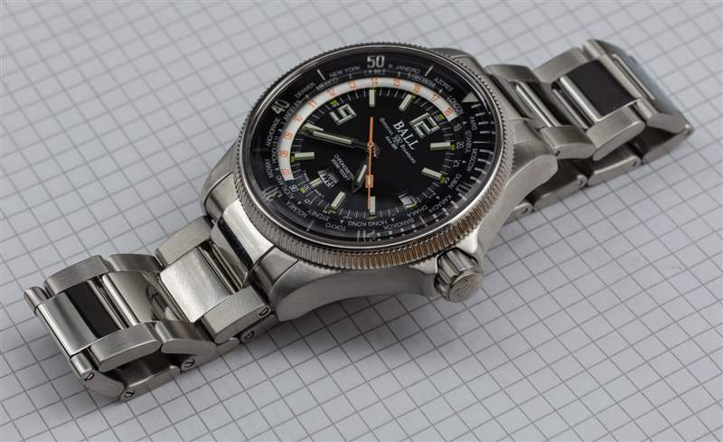 與之前手表的工程師大師 II 型表鏈相比,表殼上附有更傳統的三鏈式鋼金屬表鏈。表鏈有拉絲的外鏈節和拋光的中心鏈節,這在勞力士迪通拿或 GMT-Master II 等手表中最為流行。在這方面,DG2232A-SC-BK 感覺比上一代 Engineer Master II Diver Worldtime 更“通用”,但外觀時尚,我認為它非常適合時計的整體主題。