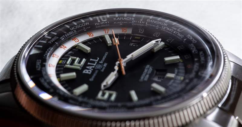 與往常一樣,Ball 充分利用了表盤指針和時標上的自發光氚氣管。在黑暗中,Engineer Master II Diver Worldtime 是一個值得一看的景象。由于世界時間手表具有外圈和內表盤的本質,與表殼的整體尺寸相比,手表上讀取時間的面感覺有點小。這沒什么大不了的,但是當您的手腕上有一塊更大尺寸的手表時,它確實需要一些時間來適應,并且用一個相對較小的表盤來讀取時間。表盤上方是一個略微圓頂的 AR 涂層藍寶石水晶鏡面。