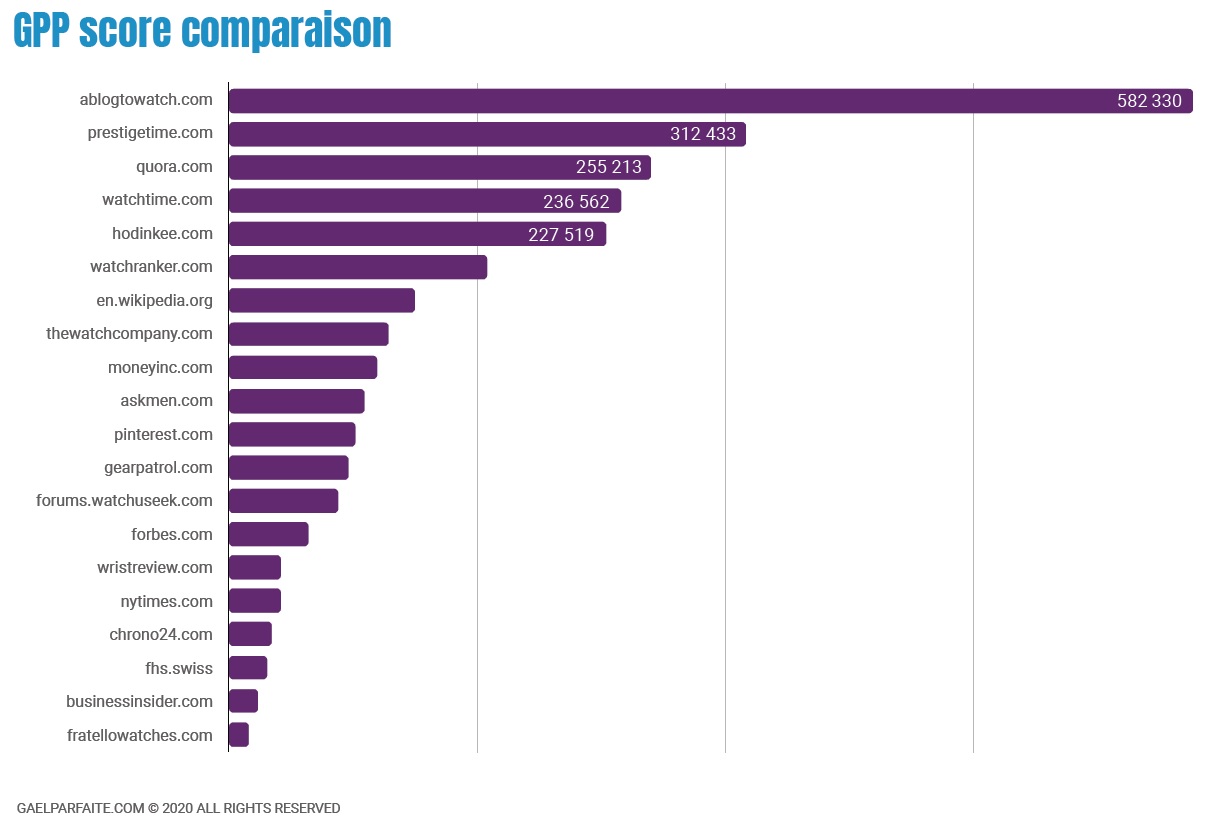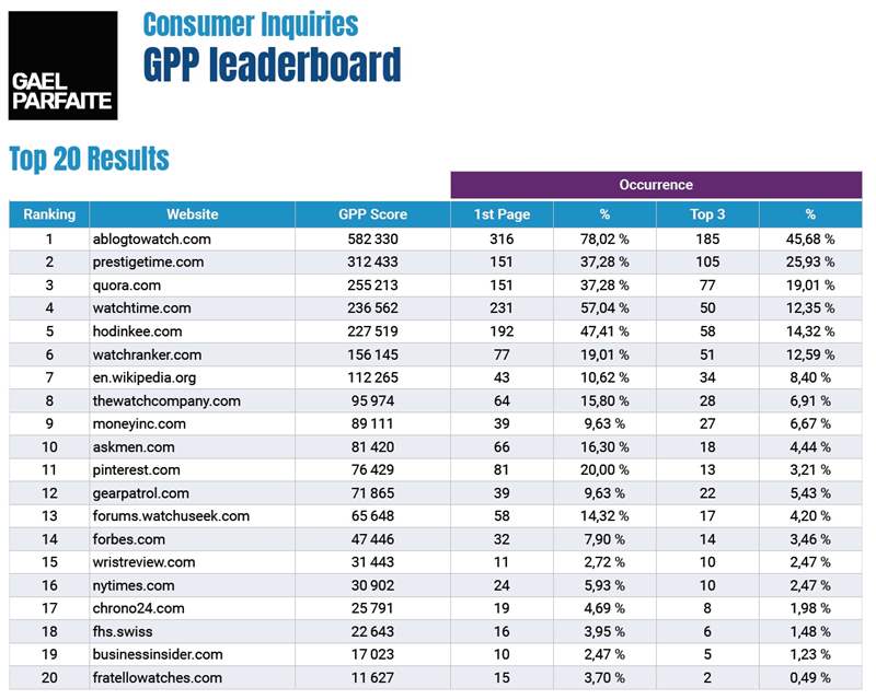 這項獨立研究首先選取了 Parfaite 先生認(rèn)為與手表行業(yè)或手表消費者購買過程相關(guān)的 20 個網(wǎng)站,然后使用專為該項目創(chuàng)建的過程對它們進(jìn)行評分。Parfaite 的方法包括一個稱為“GPP 分?jǐn)?shù)”的指標(biāo),它是幾個查詢的性能指標(biāo)的總和,例如搜索引擎排名、現(xiàn)場資產(chǎn)(例如社區(qū)評論的價值)以及網(wǎng)站整體如何被證明協(xié)助消費者決策過程。該報告進(jìn)一步跟蹤了 20 個網(wǎng)站在 45 個不同流行手表品牌的各種搜索引擎查詢中的表現(xiàn)。廣告訊息廣告信息結(jié)束