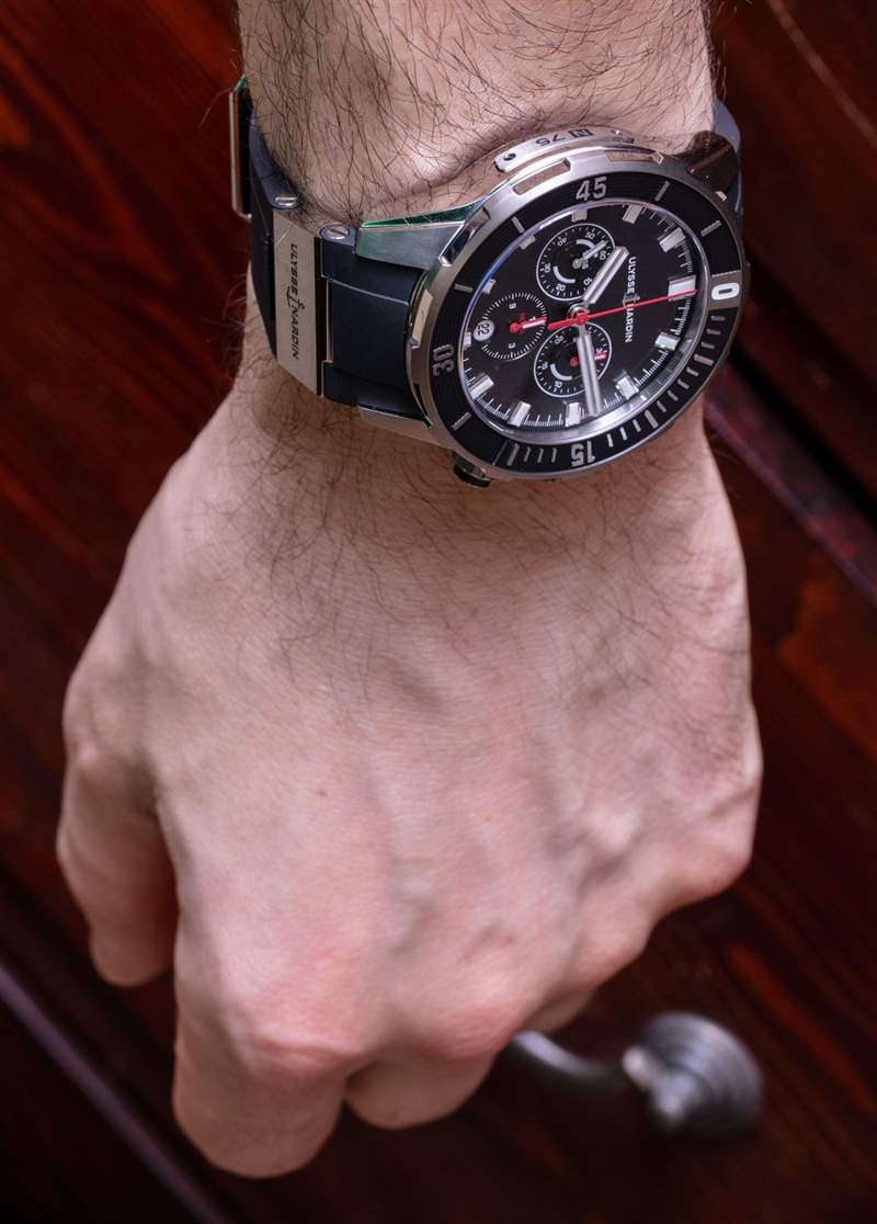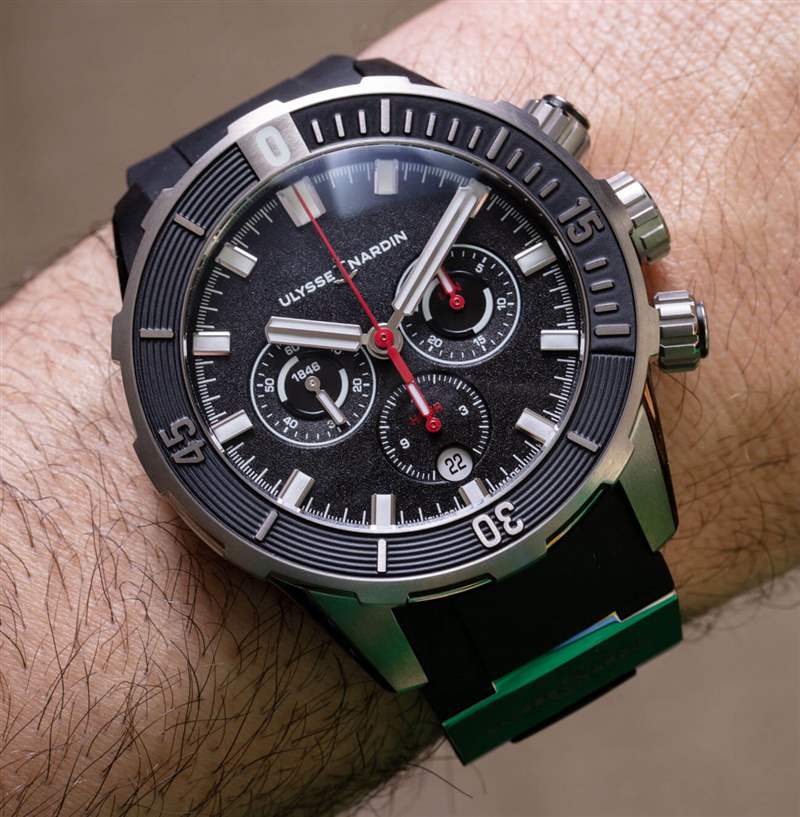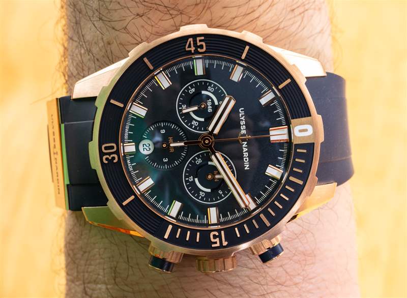 鈦金屬表殼讓手表在手腕上真的感覺很輕,這是一件好事。Ulysse Nardin 還配備了全 18k 玫瑰金參考 1502-170-3/93) 版本的 Diver Chronograph 44mm,價格幾乎是這款鈦金屬表款的四倍(38,500 美元)——并帶有額外的黃金重量開機。對于那些想帶著金表去游泳的人來說,這是一個很好的選擇,但作為工具,我不確定黃金是最好的選擇——所以,我的選擇是鈦。我認為 Diver Chronograph 的真正價值是日常佩戴的時計否則當您想將自己浸入水中時。