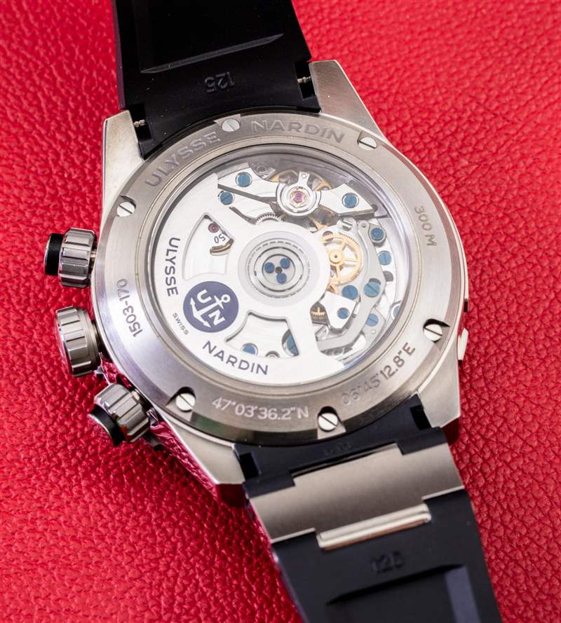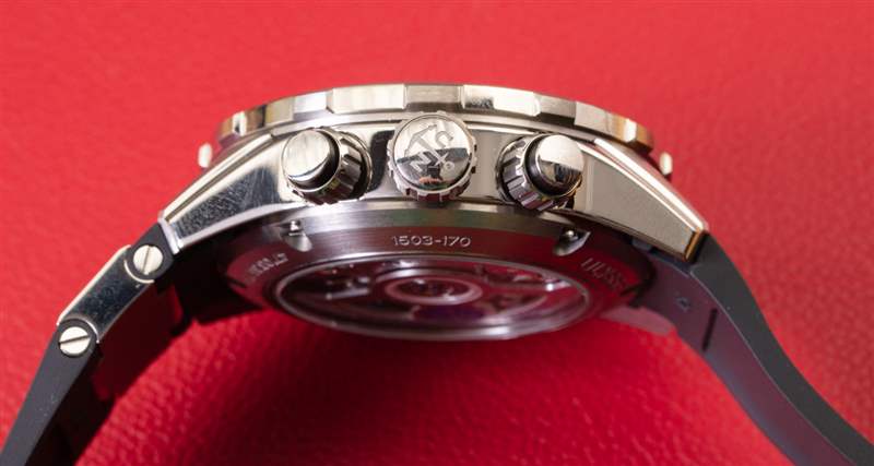 表盤周圍是一個平滑的旋轉(zhuǎn)表圈,發(fā)出悅耳的咔噠聲,其設(shè)計再次從傳統(tǒng)的雅典航海手表中汲取靈感,但也做了一些新的事情。除了表殼本身的設(shè)計,Diver Chronograph 的表圈也賦予了這款 Ulysse Nardin 腕表視覺上的獨特性。在我看來,計時碼表按鈕是旋入式的,這有點復古。雖然這是在潛水員計時碼表中獲得更多防水性能的一種經(jīng)過驗證的真正方法,但我希望看到品牌朝著計時碼表復雜功能不需要旋入式按鈕甚至可以完全操作的方向發(fā)展水下(可能不會低至 300 米,但至少 50 或 100 米)。手表的左側(cè)是一塊帶有手表序列號的小金屬牌。該區(qū)域用于限量版編號,例如僅限美國的限量版紅色、白色和藍色“Hammerhead”參考 1503-170LE-3/93-HAMMER 版本的 Diver Chronograph。廣告訊息廣告信息結(jié)束