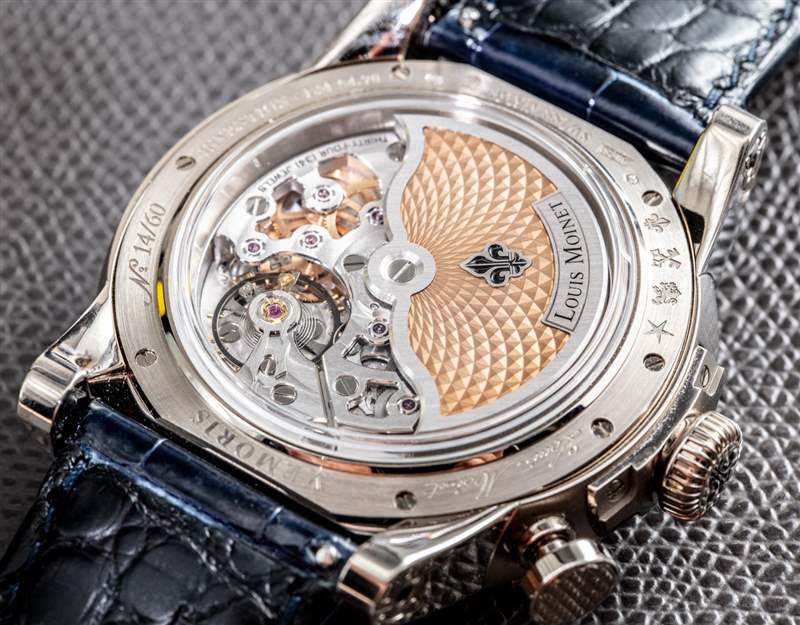 特殊之處在于,作為 Louis Moinet 口徑 LM54 自動(dòng)機(jī)制的一部分,您如何可以通過大部分表盤看到計(jì)時(shí)碼表機(jī)芯部件。機(jī)芯本身是一款裝飾精美的 4Hz 自動(dòng)上鏈機(jī)芯,擁有 48 小時(shí)動(dòng)力儲(chǔ)存,由 302 個(gè)零件組成。到目前為止,Louis Moinet 已經(jīng)生產(chǎn)了幾個(gè)版本的 Memoris,其前表盤機(jī)芯在整個(gè)系列中略有不同。對于這個(gè)型號(hào)(參考 LM-54.70.80B,在 18k 白金表殼中),表盤大部分為復(fù)古銀色,表盤為白色琺瑯,后機(jī)芯板為 PVD ??藍(lán)色涂層。如果您查看其他 Louis Moinet Memoris 手表,您會(huì)發(fā)現(xiàn)該品牌如何創(chuàng)造出一系列值得選擇的款式。雖然所有的 Memoris 手表似乎都是限量版的一部分,