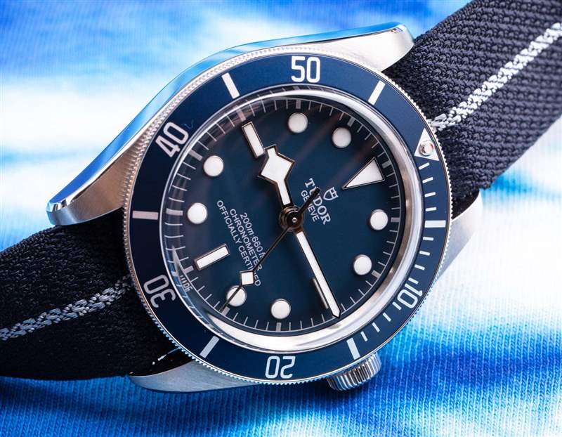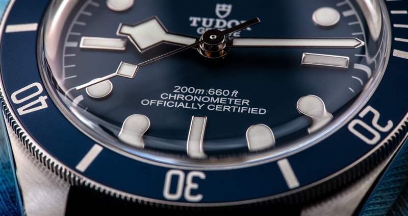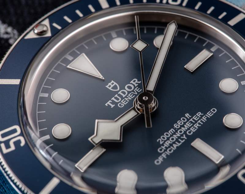 這是一個(gè)只有時(shí)間的表盤(pán),這意味著它提供分鐘、小時(shí)和秒(全部涂有夜光),沒(méi)有日期窗口(這在碧灣手表系列中并不常見(jiàn))。與帶有鏤空日期窗口的手表相比,無(wú)日期手表的表盤(pán)更干凈、對(duì)稱,因此受到許多愛(ài)好者的青睞。否則,表盤(pán)既干凈又實(shí)用,盡管我認(rèn)為很多人都同意,如果沒(méi)有表盤(pán)上“Chronometer”標(biāo)簽下的“Officially Certified”文字聲明,帝舵就可以做到。任何標(biāo)有天文臺(tái)表的手表都必須經(jīng)過(guò)官方認(rèn)證,因此該聲明是不必要的多余。是的,這也是勞力士在其表盤(pán)上放置的東西——但這些是其他手表,通常被手表愛(ài)好者看不起,因?yàn)樗鼈冇小斑^(guò)多的表盤(pán)文字”。話說(shuō)回來(lái),