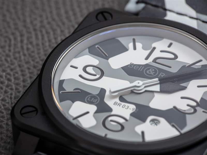 BR 03-92 Camo 是核心 BR 03-92 Instrument 手表的全新限量版,它是較大的 BR 01-03(46 毫米寬)的較小的 42 毫米寬版本。對于這款特殊的產(chǎn)品,Bell & Ross 從啞光黑色陶瓷表殼開始,然后將駕駛艙時(shí)鐘風(fēng)格的表盤呈現(xiàn)為白色和灰色的都市風(fēng)格迷彩。手表配有兩條表帶。一個(gè)是黑色橡膠表帶,另一個(gè)是皮革表帶,上面印有相同的白色迷彩圖案。廣告訊息廣告信息結(jié)束