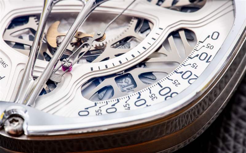 分鐘和小時顯示在 9 點鐘附近,重要的是要提到時間以 24 小時而不是 12 小時格式顯示。這不是史無前例的,但肯定不常見——尤其是對于游蕩時間系統。沒錯,與 Urwerk 和其他一些異國情調的手表類似,Perception 使用一系列旋轉時標盤,沿著分鐘刻度“游走”,以“數字化”指示小時和作為功能的分鐘這些移動的“衛星”的運動。每顆衛星的形狀都類似于卡拉特拉瓦十字架,如果您向前或向后調整時間,您可以看到它們在一些鏤空表盤元素下移動。