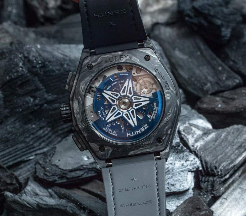 50Hz 足以讓 Zenith(以及之前的 TAG Heuer)聲稱計(jì)時碼表精度為 1/100 秒。在數(shù)字計(jì)時設(shè)備的世界中,這并不是特別奇妙 – 但如果您存在于機(jī)械計(jì)時的環(huán)境中,那就是。9020 自動機(jī)芯本身采用新的“Defy 風(fēng)格”設(shè)計(jì),這是該型號的當(dāng)前系列。機(jī)芯橋板的藍(lán)色調(diào)與表盤和表殼的黑色調(diào)相得益彰,為這款腕表的“彪悍”增添了色彩。
