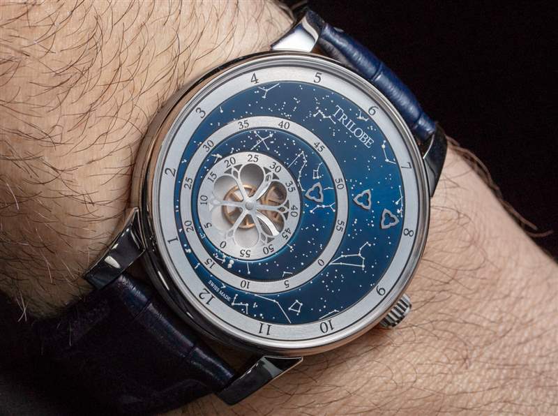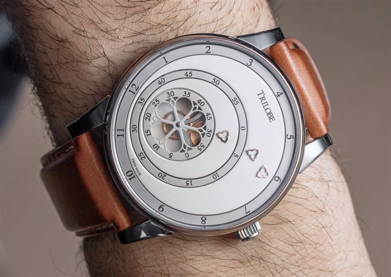 像 Les Matinaux 這樣的手表的訣竅是防止表盤看起來太平。手表表面采用了各種技術來解決這個問題,但沒有指針的表盤仍然存在這個問題。另一個問題(真的是口味問題)是用于讀取時間的指示箭頭的位置。它們被偏心地放置在表盤上,這是 Trilobe 有目的的舉動,同時也不會吸引其他個人要求更精確對稱的鐘表愛好者。