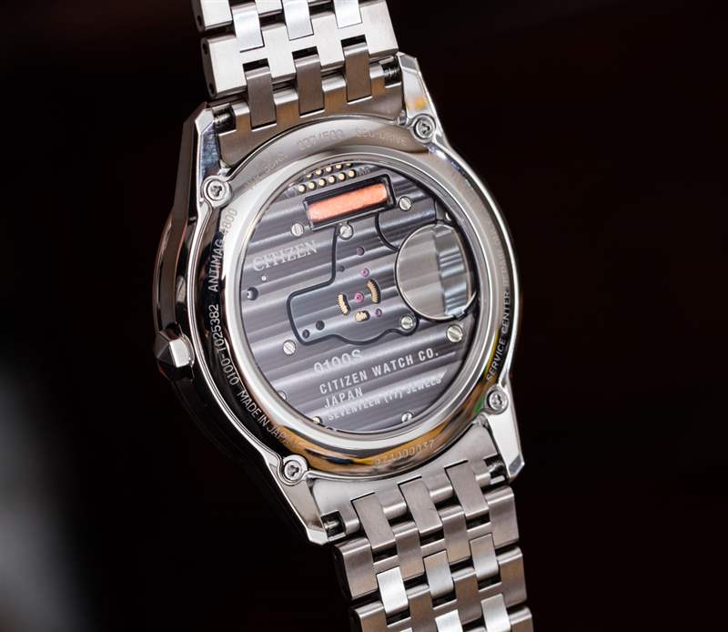 Calibre 0100 本質(zhì)上類似于典型的石英機(jī)芯,但使用了類固醇。它也恰好依靠更強(qiáng)大的系統(tǒng)來解決問題,同時依靠僅通過光不斷充電的電池汲取電力。Calibre 0100 可能是所有 Citizen Eco-Drive 機(jī)芯的最大成就,因為它為高頻石英機(jī)芯提供了足夠的動力。這怎么可能對我來說是一個謎,公民可以理解地保持密切。