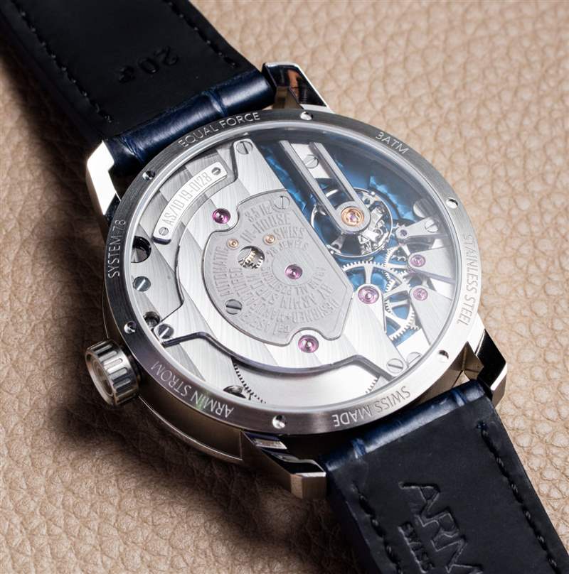 在手腕上,Gravity Equal Force 手表比許多其他 Armin Strom 手表要小得多,只有 41 毫米寬和 12.6 毫米厚。這款手表以鋼制成,但該品牌也可以很高興地用其他材料生產它。表殼防水深度達 30 米,雙面藍寶石水晶。請注意外殼底部的殘留“唇緣”。在其他 Armin Strom 手表上,這塊更大,最初的設計是為了讓 Armin Strom 可以在那里刻上所有者的姓名首字母。通過一些調整(很容易做到),Gravity Equal Force 手表可能會成為 Armin Strom 的另一大熱門。