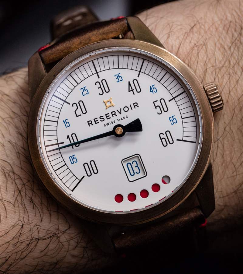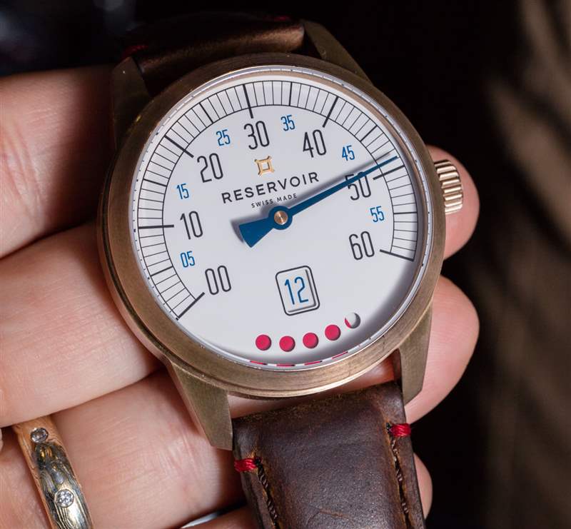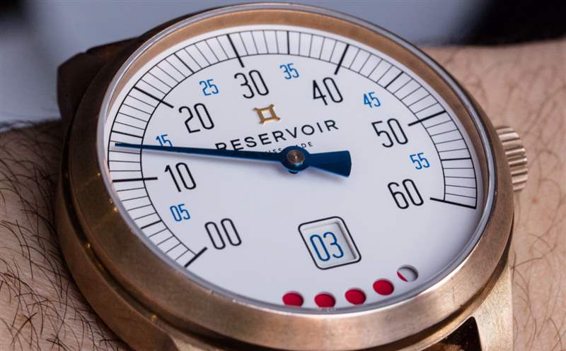 就個人而言,我并不熱衷于測試其他人的模擬計時能力,而是喜歡這些提高易讀性的實驗。根據表盤設計,我實際上發現跳時表比傳統的中央安裝時針和分針的手表更容易一目了然。鑒于 Reservoir 時間指示系統有一個不會立即發生的輕微訓練曲線,我懷疑只佩戴這款手表幾周將使佩戴者能夠以同樣快的速度閱讀時間,如果不是比在傳統的模擬手表表盤顯示上顯示時間。