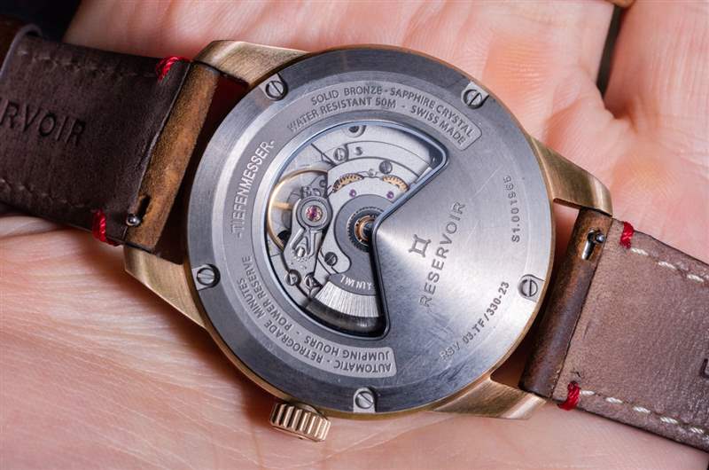瑞士制表商Reservoir于 2019 年發布了其以潛艇設備為靈感的 Tiefenmesser 腕表的有吸引力的版本,被稱為參考 RSV03.TM/330-23 Reservoir Tiefenmesser Bronze。“Tiefenmesser”在德語中是“深度計”的意思,這正是這款帥氣時計表盤的靈感來源。潛水艇和其他 20 世紀早期至中期儀器上的白色表盤工業壓力或深度計的圖片是該品牌該系列的直接美學模擬,該系列當前的主題是圍繞獨家逆跳分鐘和跳躍構建鐘表 -小時機械裝置用于為其手表提供動力。