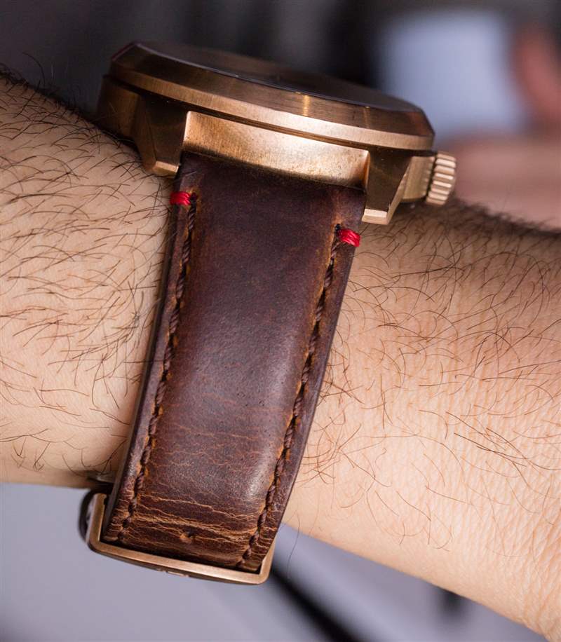 在手腕上,表殼寬 43 毫米,正面和背面都有藍寶石水晶,防水等級為 50 米。如需更多防水性能,請務必查看該品牌的潛水表式 Hydrosphere 系列。Reservoir 將手表與這里看到的棕色皮革表帶和深灰色的運動型北約風格表帶搭配在一起,中間有一條藍色條紋。它確實使手腕看起來很漂亮,尤其是青銅金屬表殼材料的暖色調。