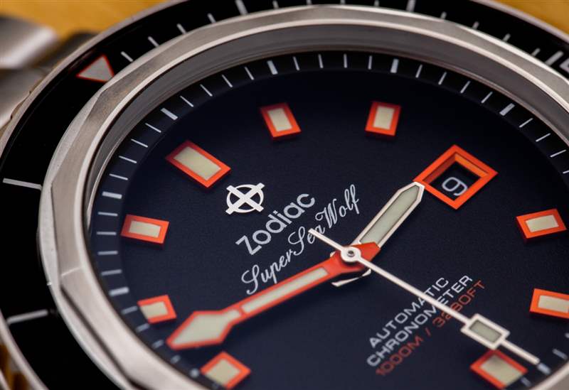 44 毫米寬的表殼采用磨砂精鋼(實際上非??常少見),表圈采用拉絲精鋼制成。表殼的酒桶形風格是 1960 年代和 1970 年代潛水表的一部分。每家公司都對這個主題有自己的看法——包括 Zodiac。名稱中的“68”部分指的是該表的靈感來自 1968 年的原始 Zodiac Saturation 潛水表。與 Zodiac Super Sea Wolf 53 相比,68 具有更高的防水性,當然,外觀也不一樣. 16 毫米厚的表殼可防水 1,000 米。表盤上方是 AR 涂層藍寶石水晶。