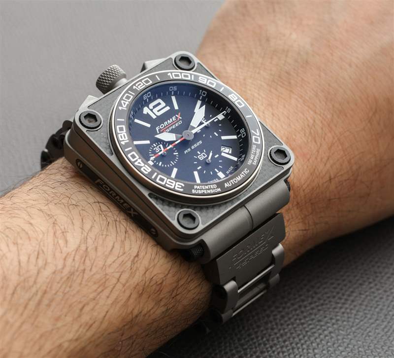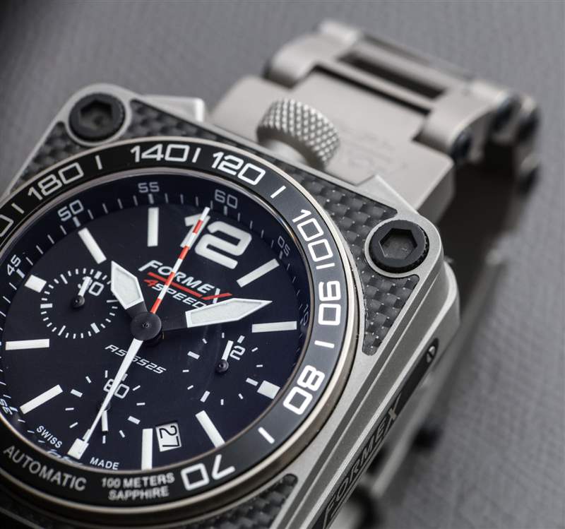 平鋪的牛頭式方形表殼讓這款 4Speed RS 6525 腕表更具個性。44 毫米方形表殼(防水 100 米)由鈦金屬制成,帶有一些鋼制部件,是一件有趣的工程。除了表殼懸掛裝置外,表殼還具有鉸接式表耳,以幫助它貼合更小的手腕,并且可以傾斜,這樣當(dāng)您的手在轉(zhuǎn)向時,在手腕上時更容易看到它車輪。該表殼的表冠和按鈕位于表殼頂部,而不是側(cè)面,使其成為牛頭式計時碼表。表殼的側(cè)面有非常優(yōu)質(zhì)的 Formex 品牌銘牌,表圈周圍的表殼頂部有真正的碳纖維鑲嵌。(當(dāng)時,