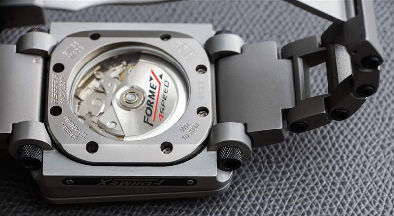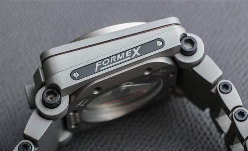 欣賞 Formex 當(dāng)時所做的獨特性的一個好方法是查看 4Speed 手鏈。與手表的其他部分一樣,它采用深灰色鈦金屬噴砂處理(當(dāng)然,與表殼相匹配)。手鐲的設(shè)計輕巧但非常耐用——而且它看起來很重要。鈦金屬結(jié)構(gòu)和鏤空鏈節(jié)營造出有趣而實用的外觀,而鏈節(jié)、表耳和表圈上明顯超大號的黑色六角螺絲則賦予腕表一種嚴(yán)肅的力量感。最后,手鐲有一個折疊的展開式表扣,帶有一個實際的表扣鎖開關(guān)。這并不完全是獨一無二的,但很少見,F(xiàn)ormex 做得很好。Formex 為 4Speed RS 6525 腕表配備了一系列賽車風(fēng)格的表帶,但搭配如此獨特的表鏈,讓人難以錯過。