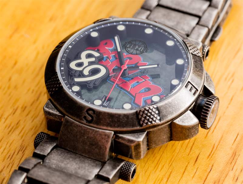 如果您去過柏林——尤其是柏林墻倒塌后的前二十年,您會立即體會到表殼和表鏈“陳舊、工業化”的外觀是如何與城市氛圍融為一體的。雖然有時表殼感覺有點像設計元素的大雜燴,但考慮到當前流行的“復古風格”(或者全新的)時計,它帶來了一種陽剛而舒適的美感。為了達到這種老化效果,100 米防水(表盤上方有藍寶石水晶)精鋼表殼和表鏈被賦予了視覺效果涂層。